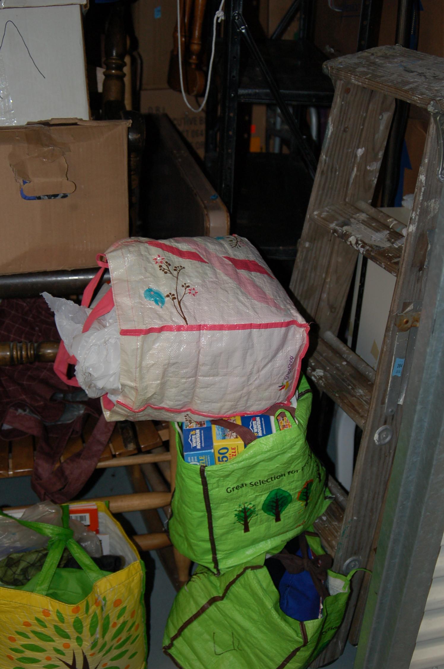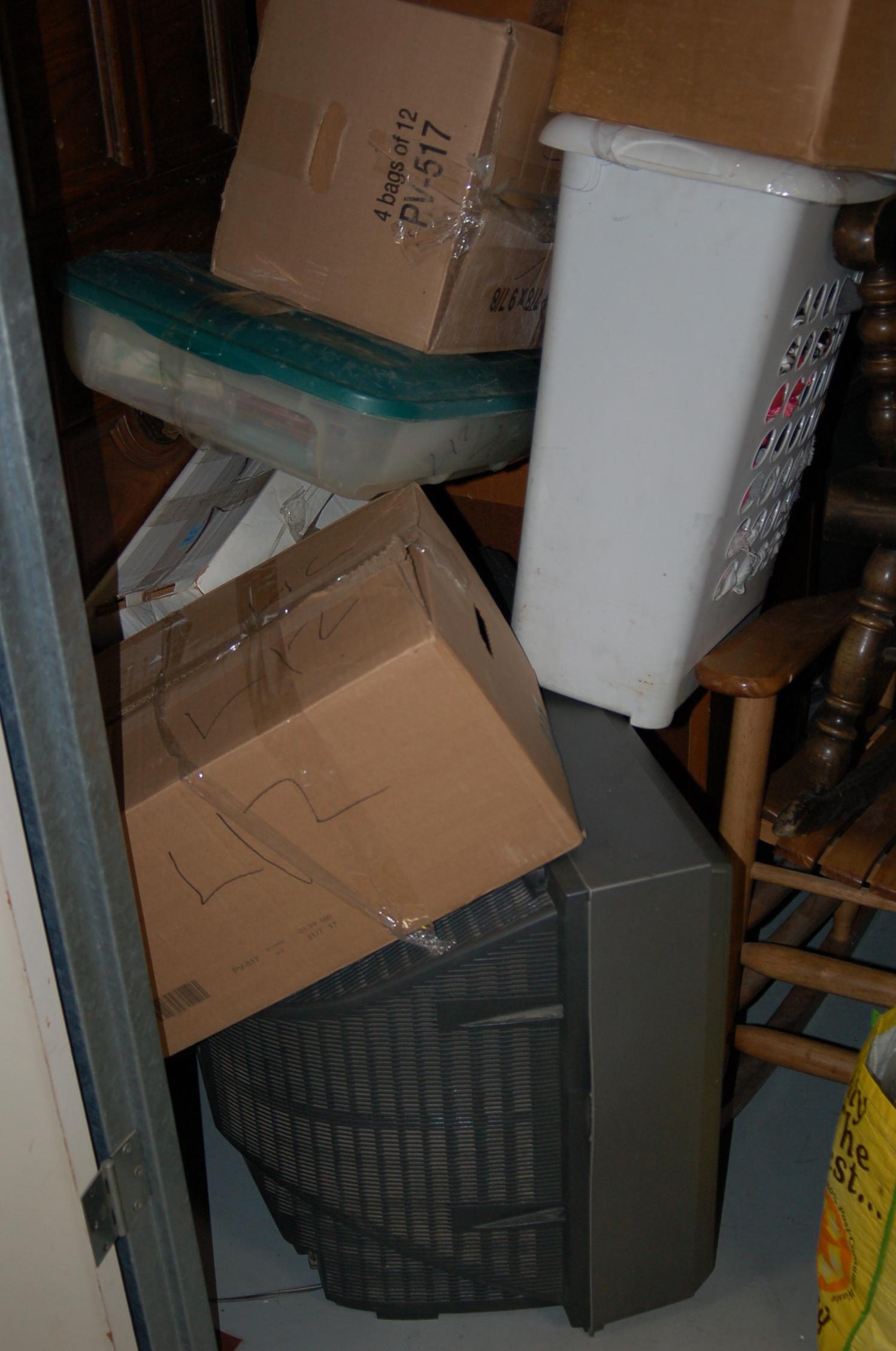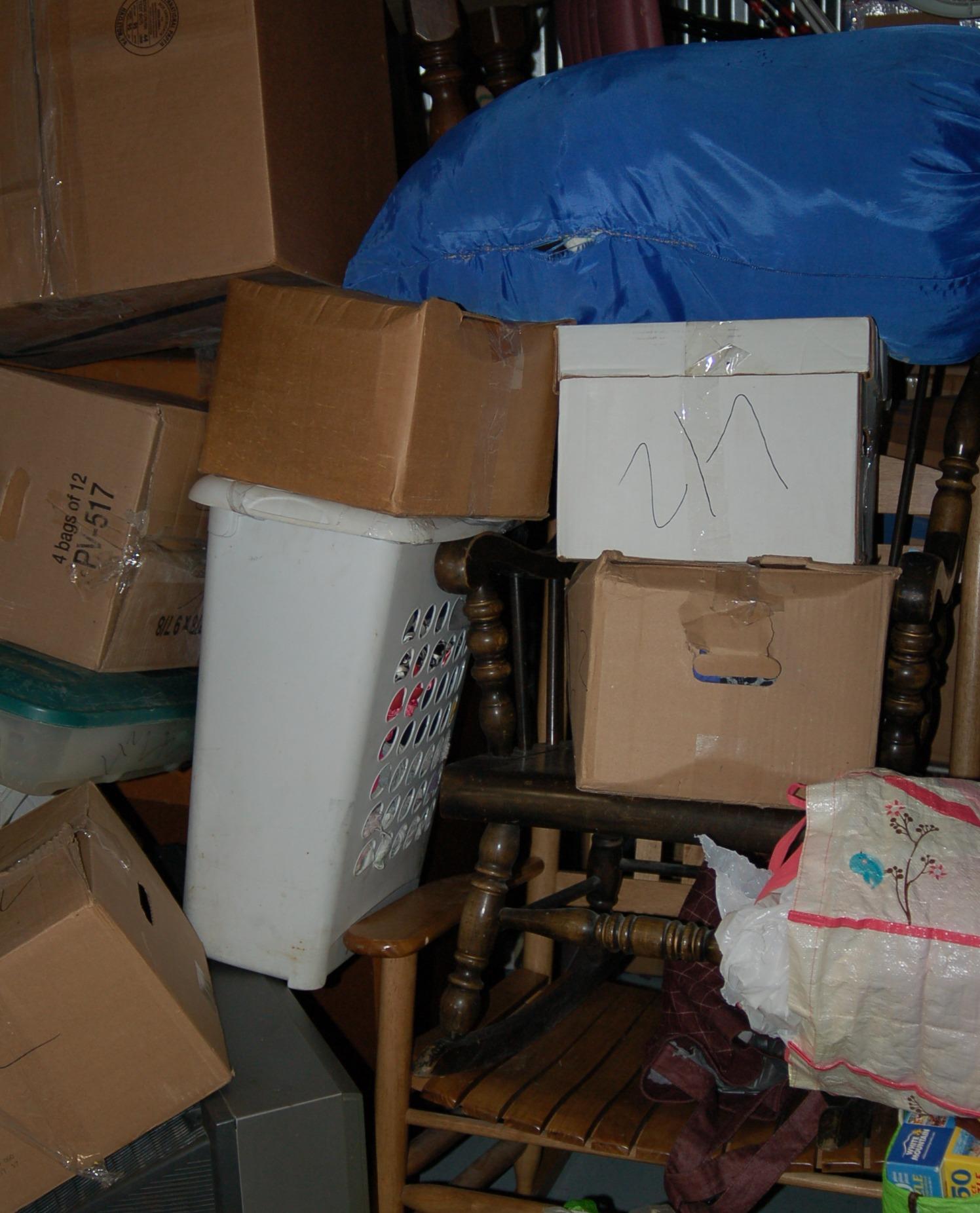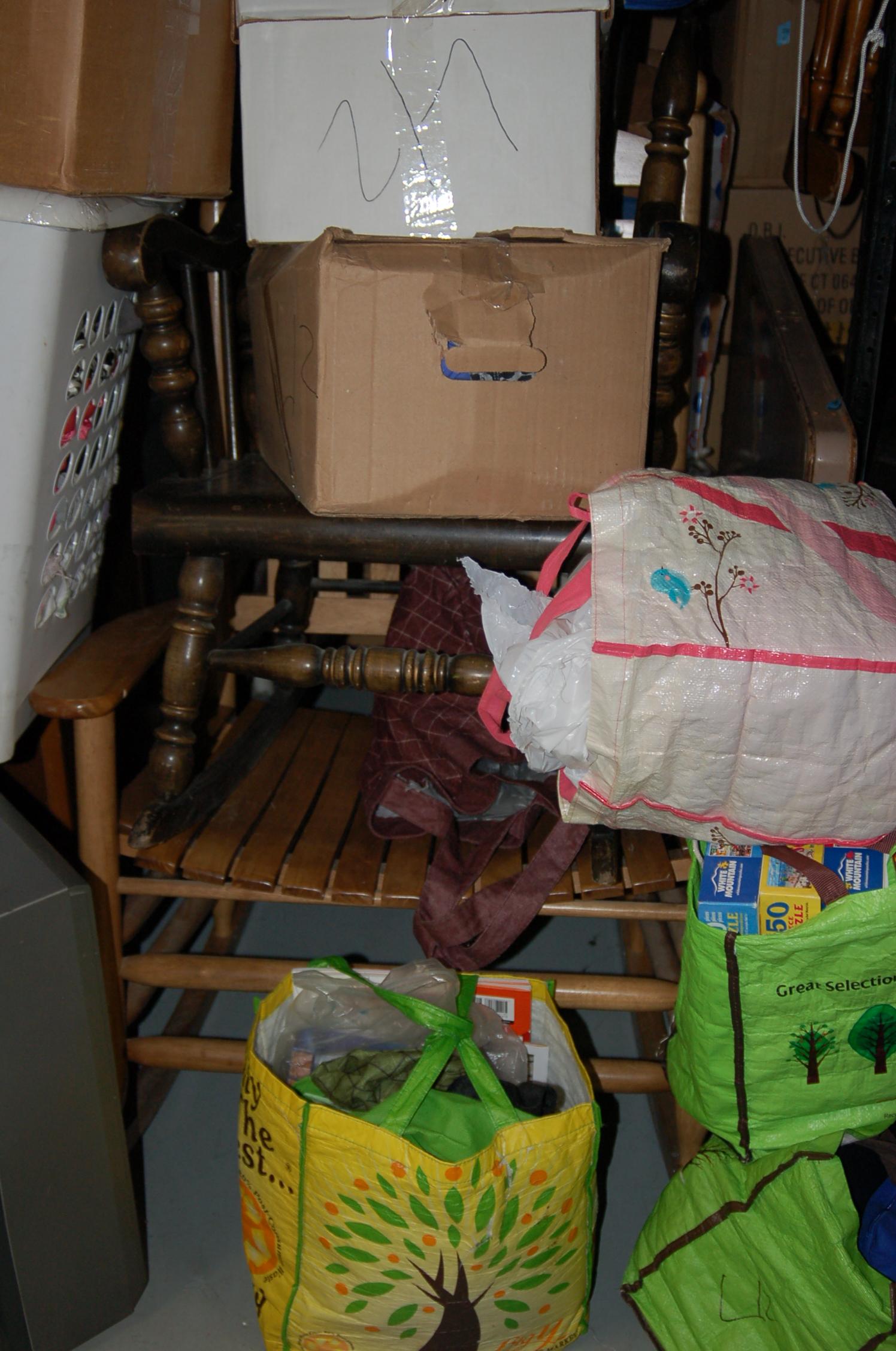 Bags, boxes chairs, dresser, ladder, lamp, rocking chairs, shelf, dining room table, night table, TV, totes