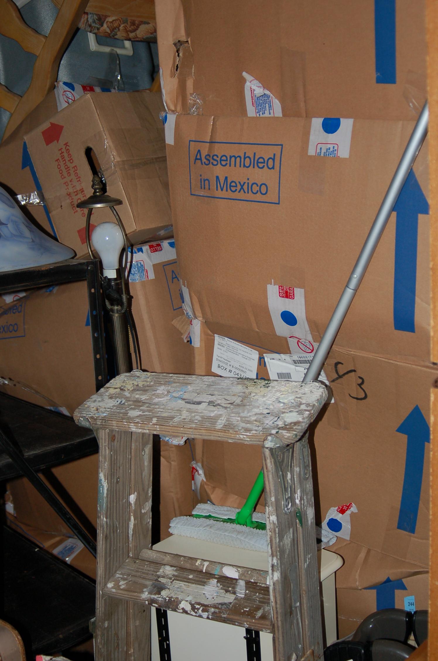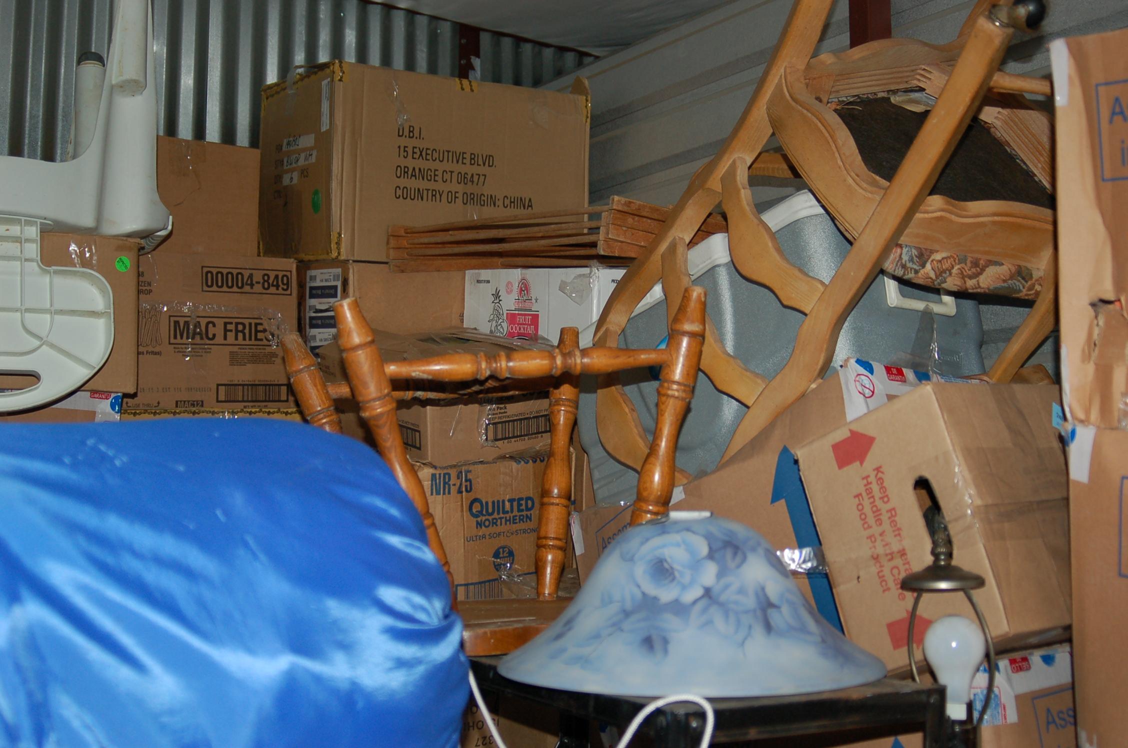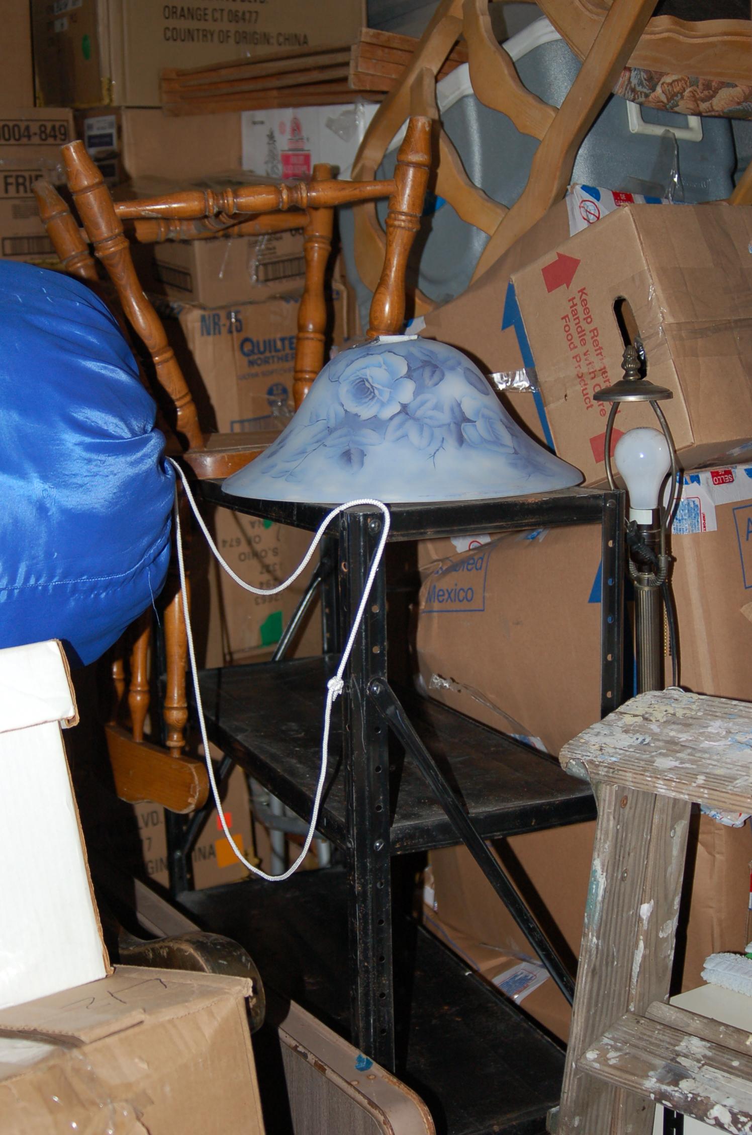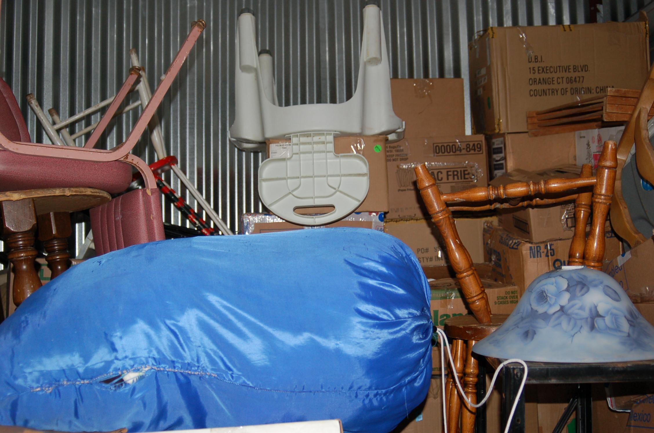 Bags, boxes chairs, dresser, ladder, lamp, rocking chairs, shelf, dining room table, night table, TV, totes
