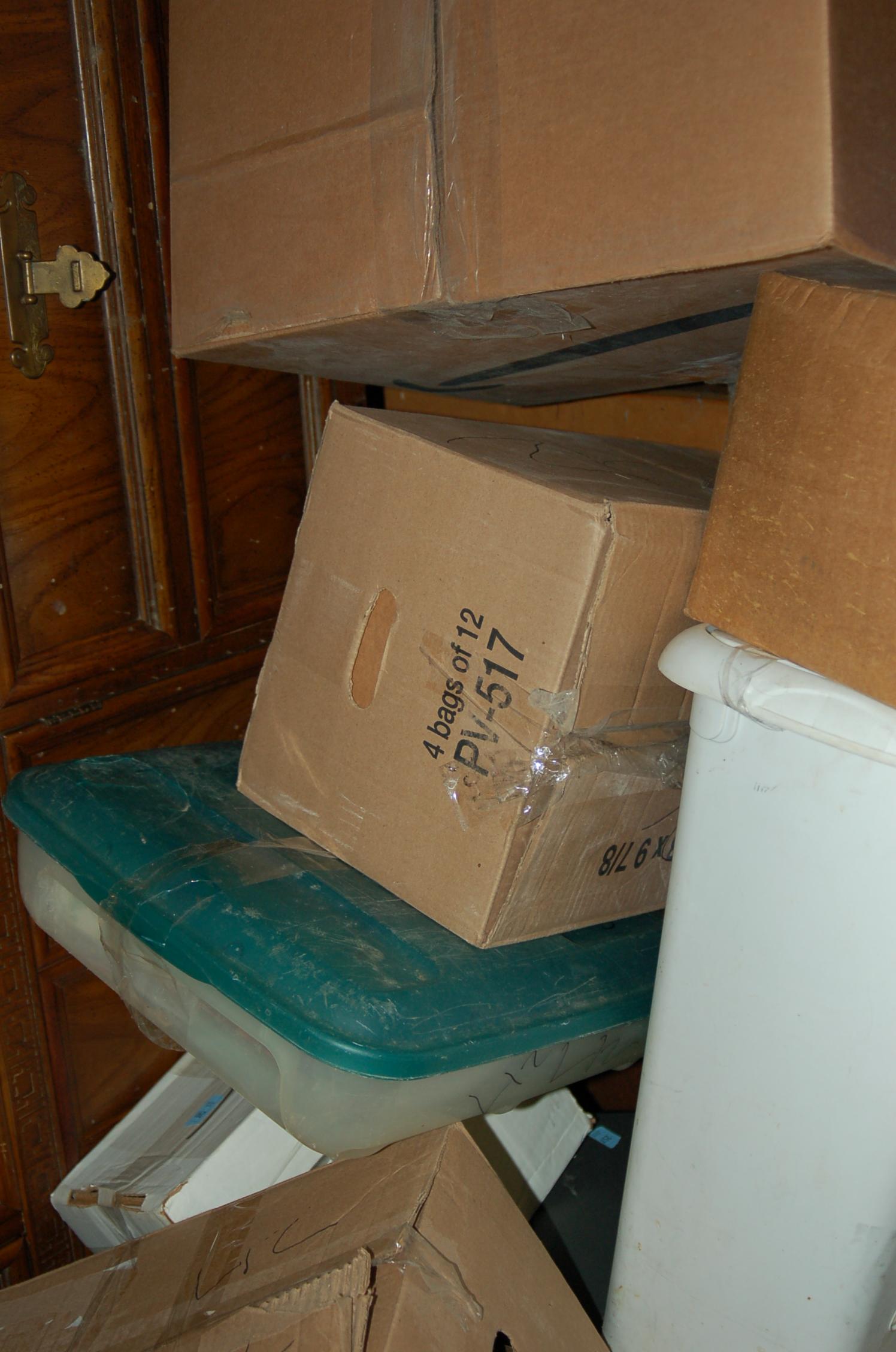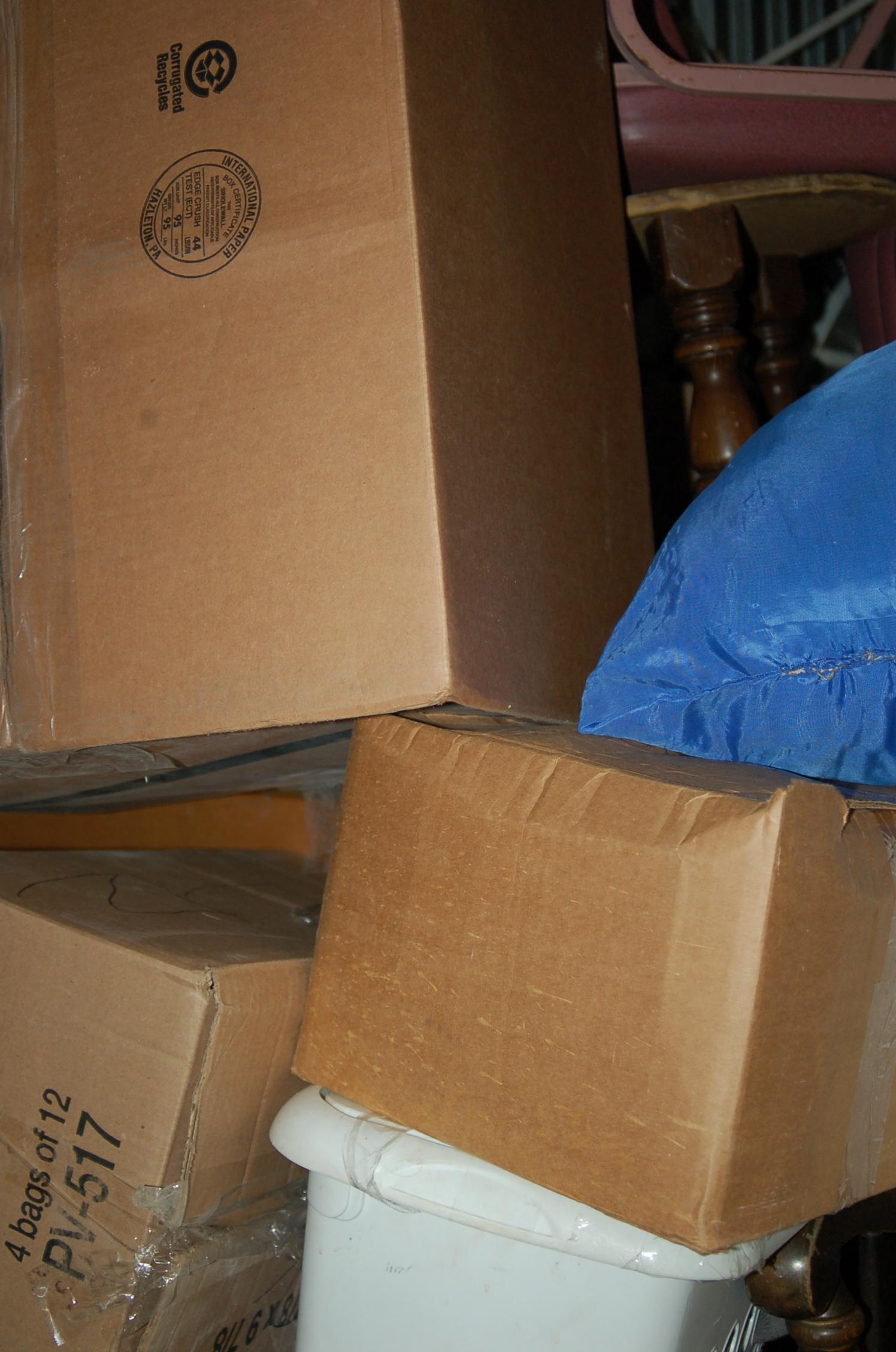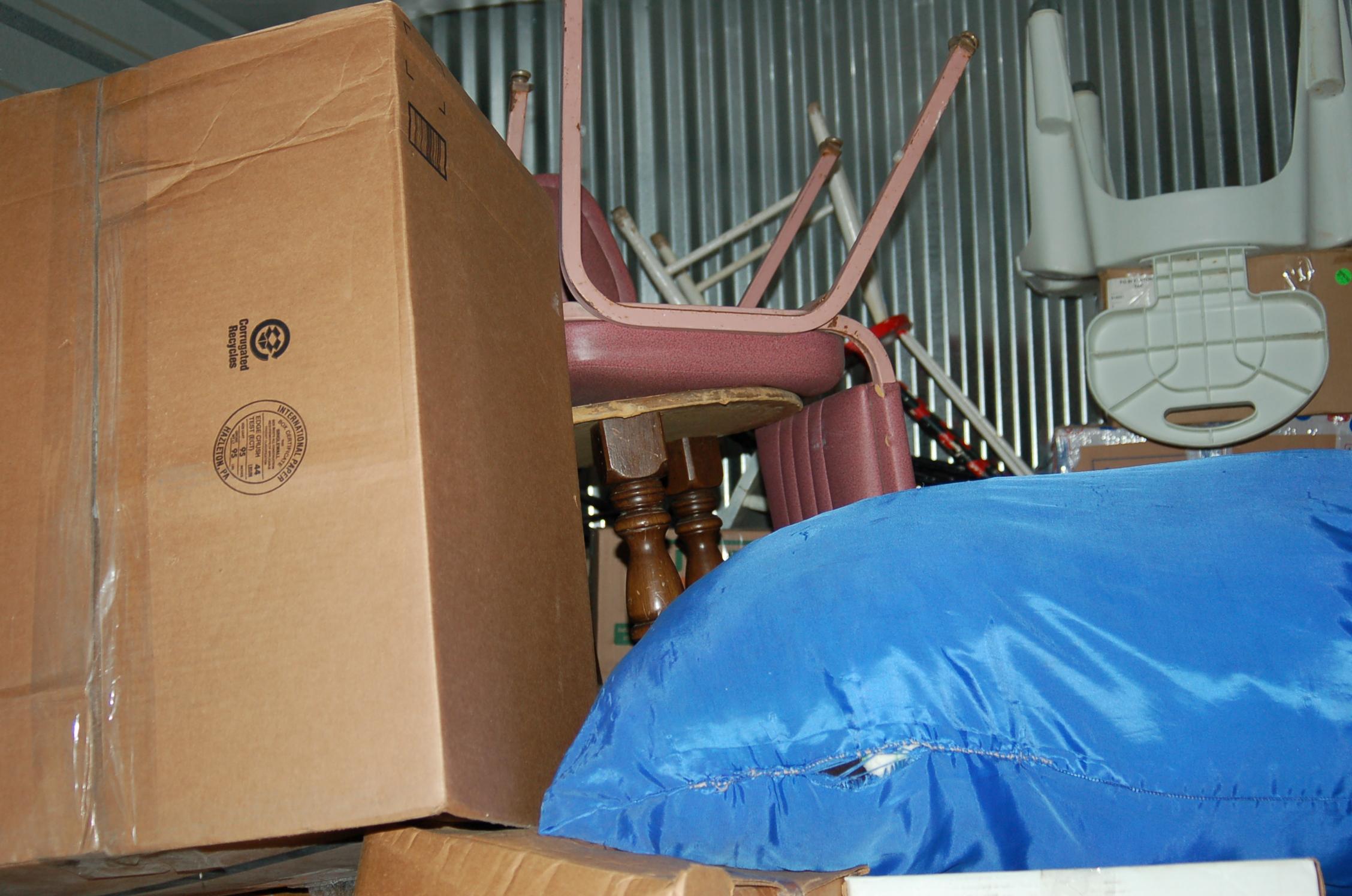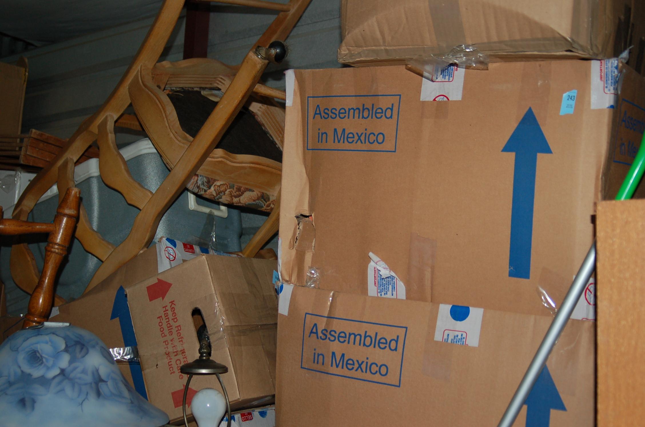 Bags, boxes chairs, dresser, ladder, lamp, rocking chairs, shelf, dining room table, night table, TV, totes