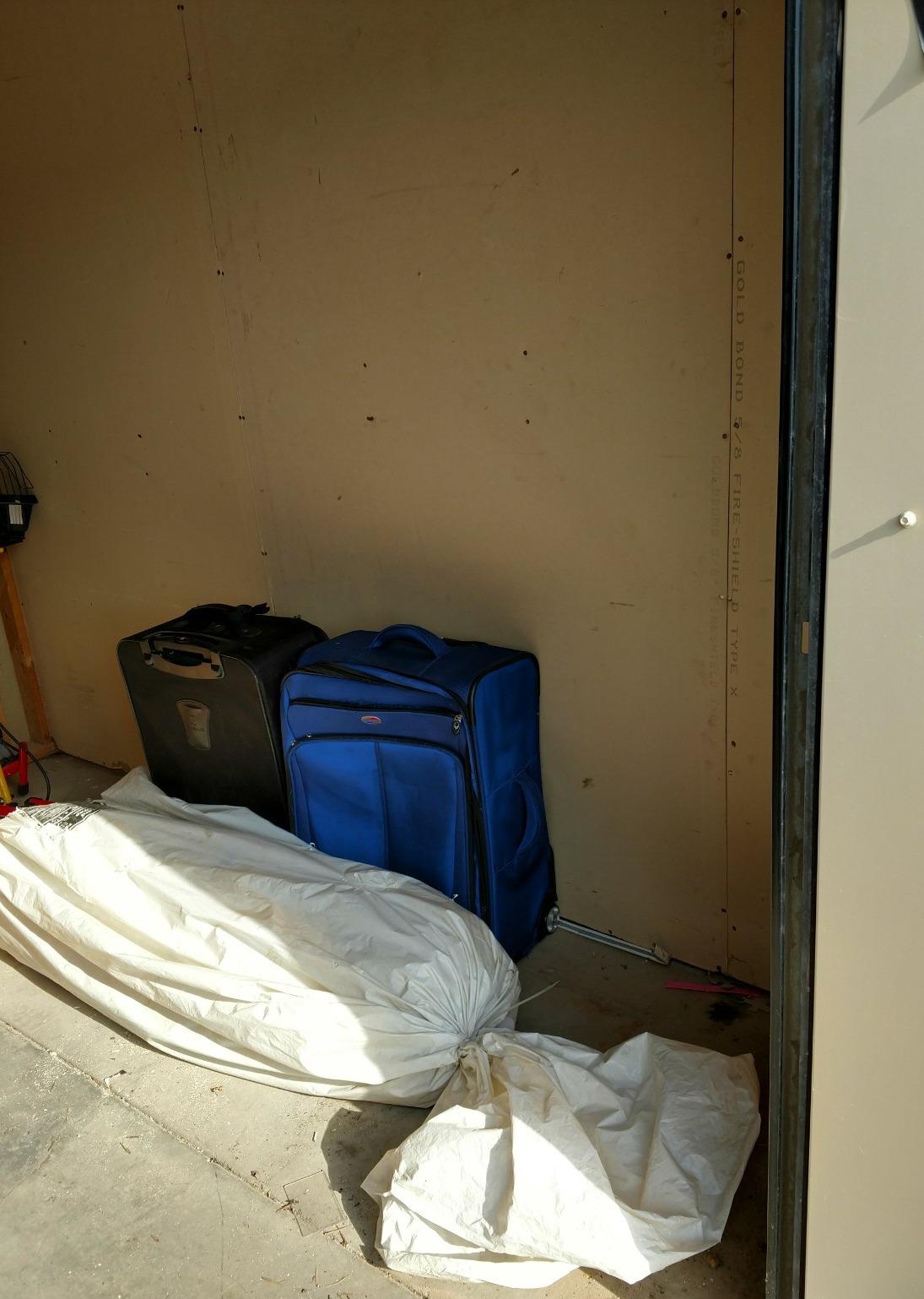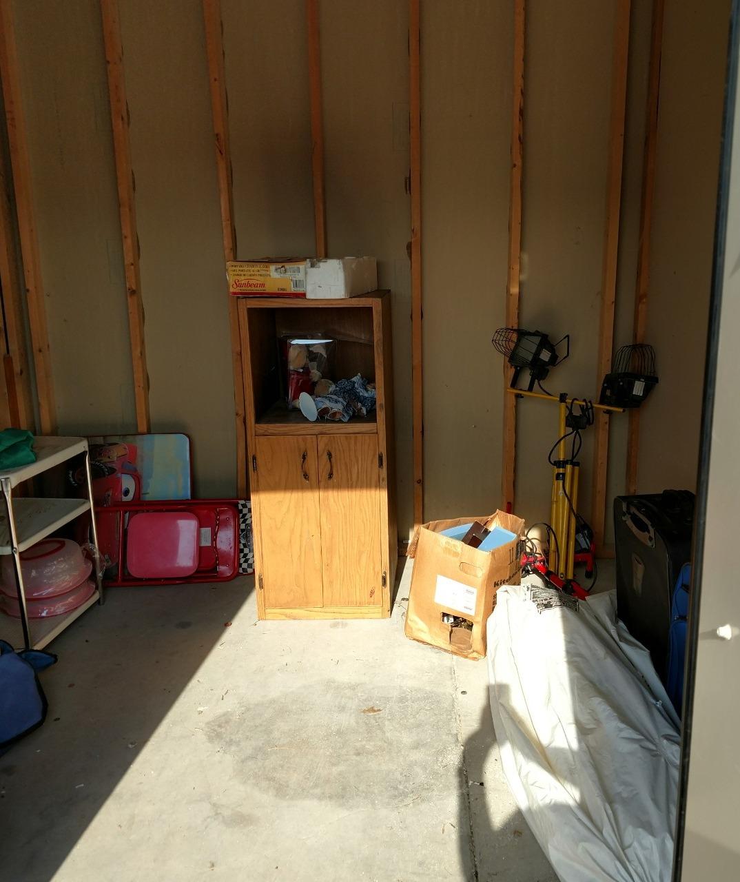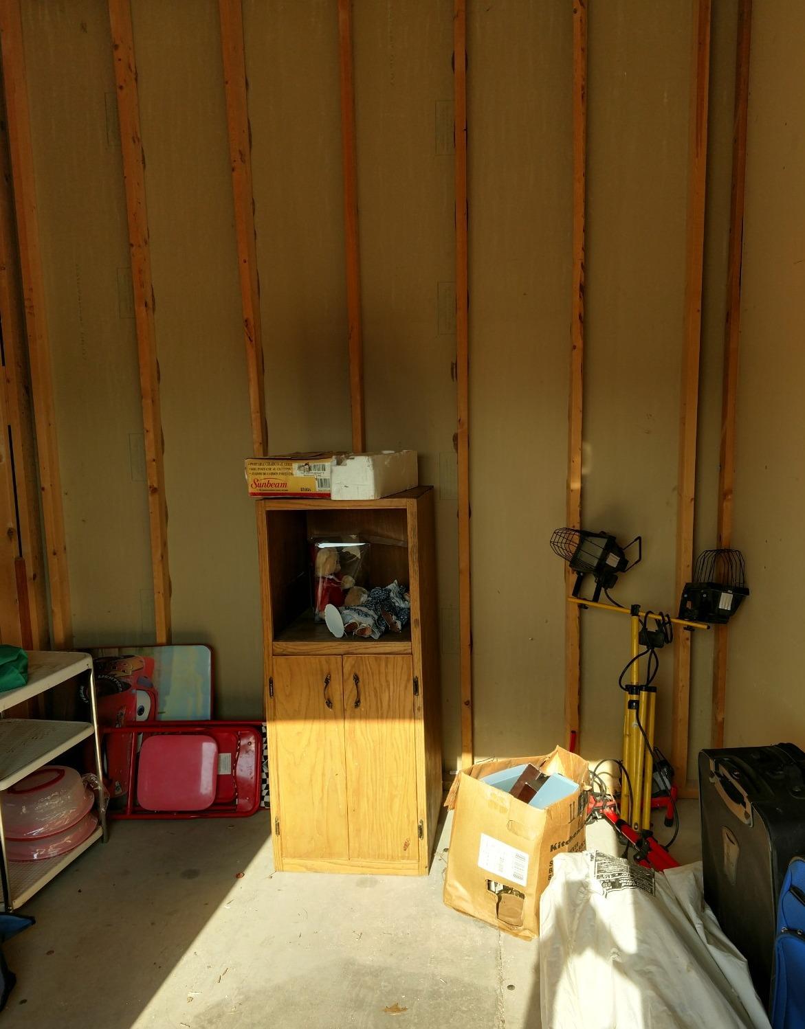 cabinet, work light, shelf, boxes, suitcases, luggage, misc items