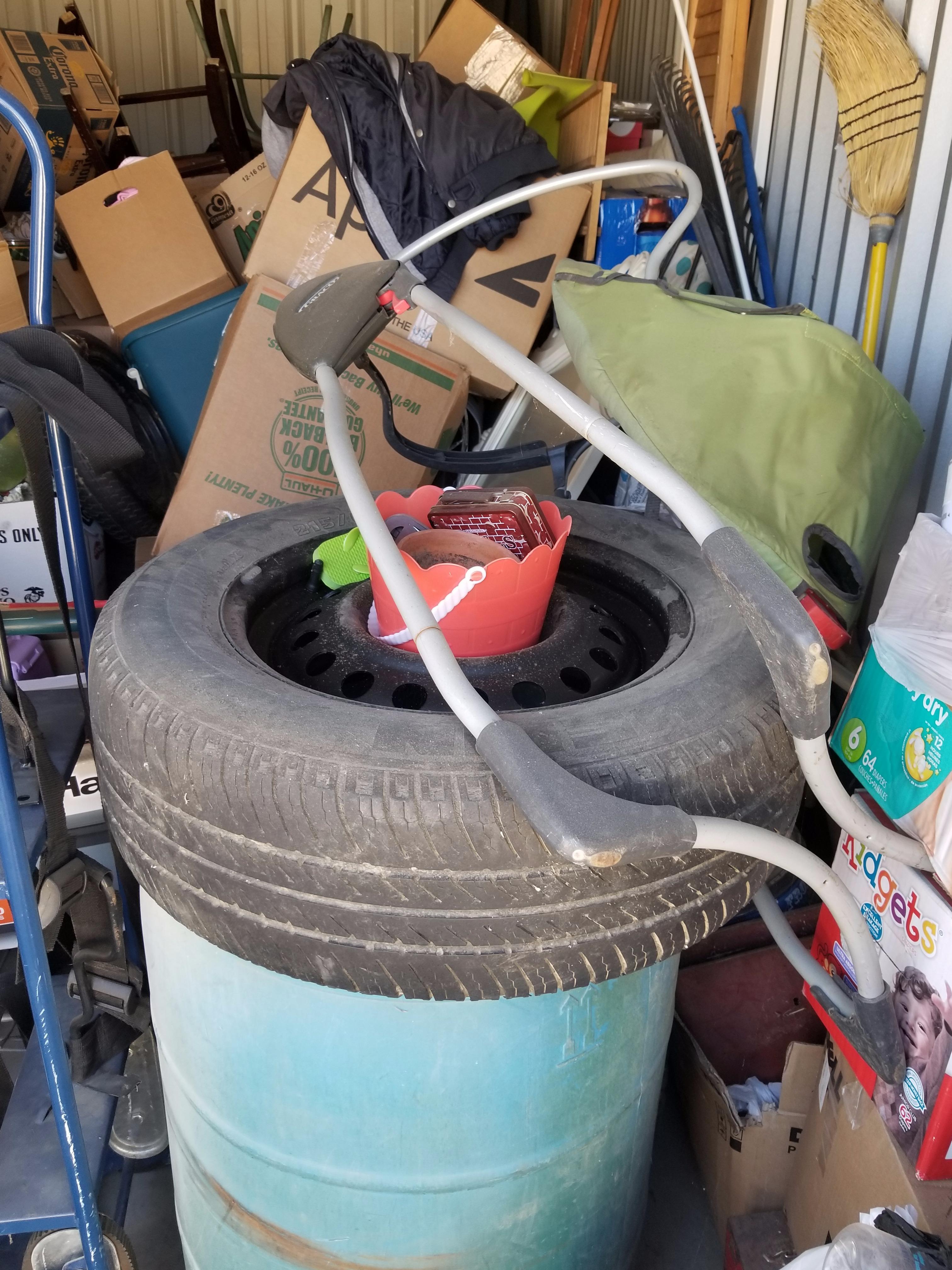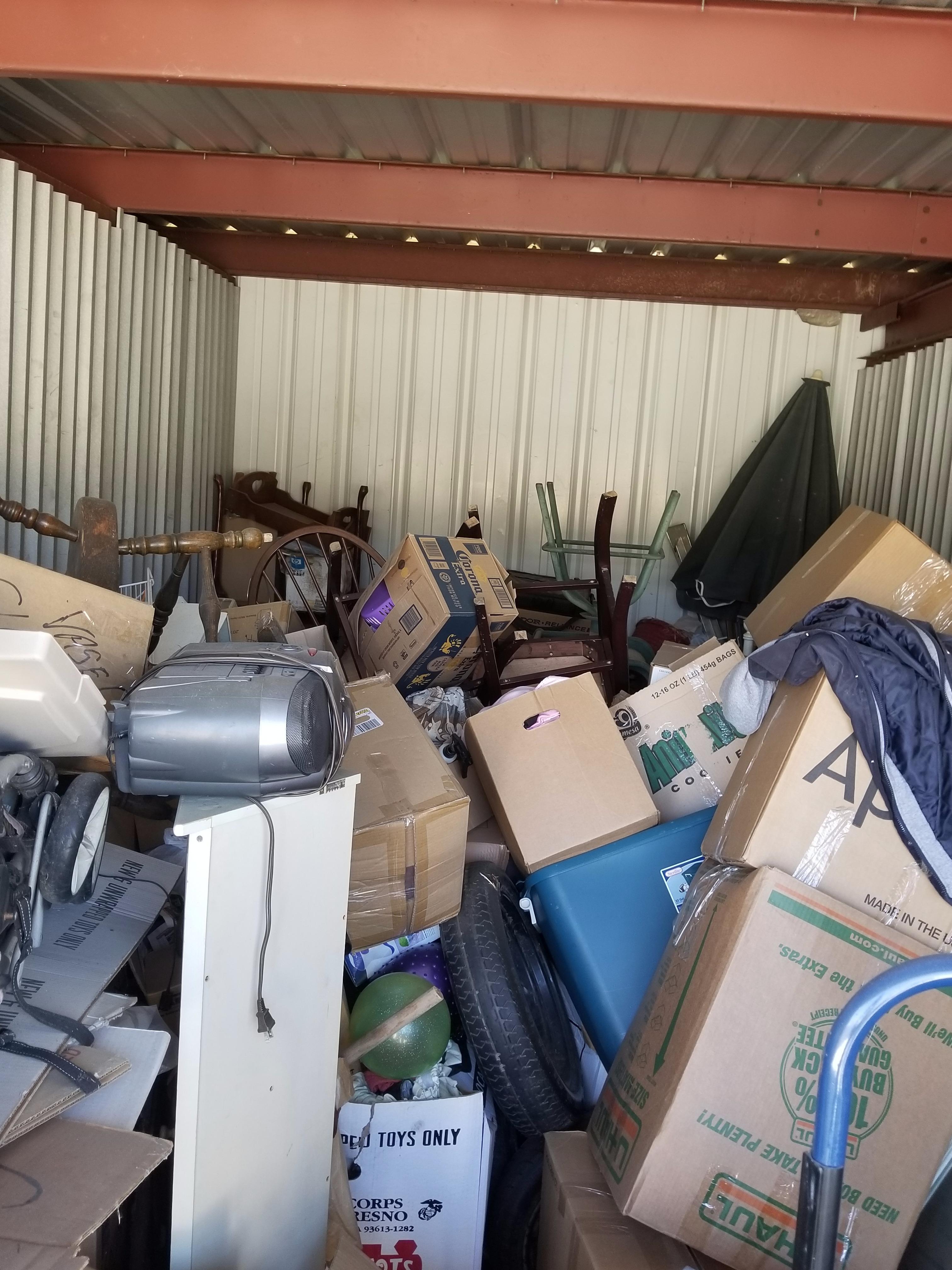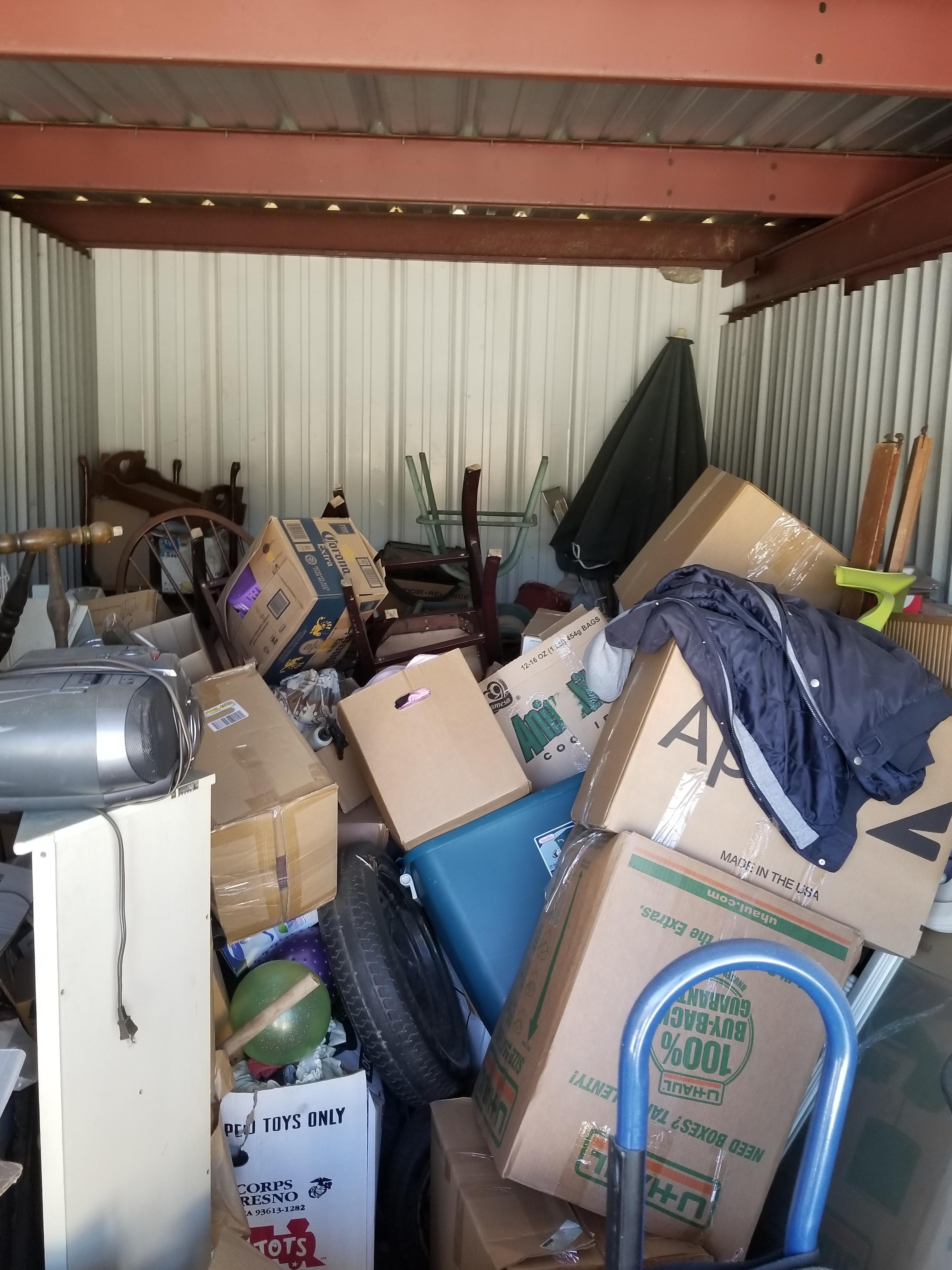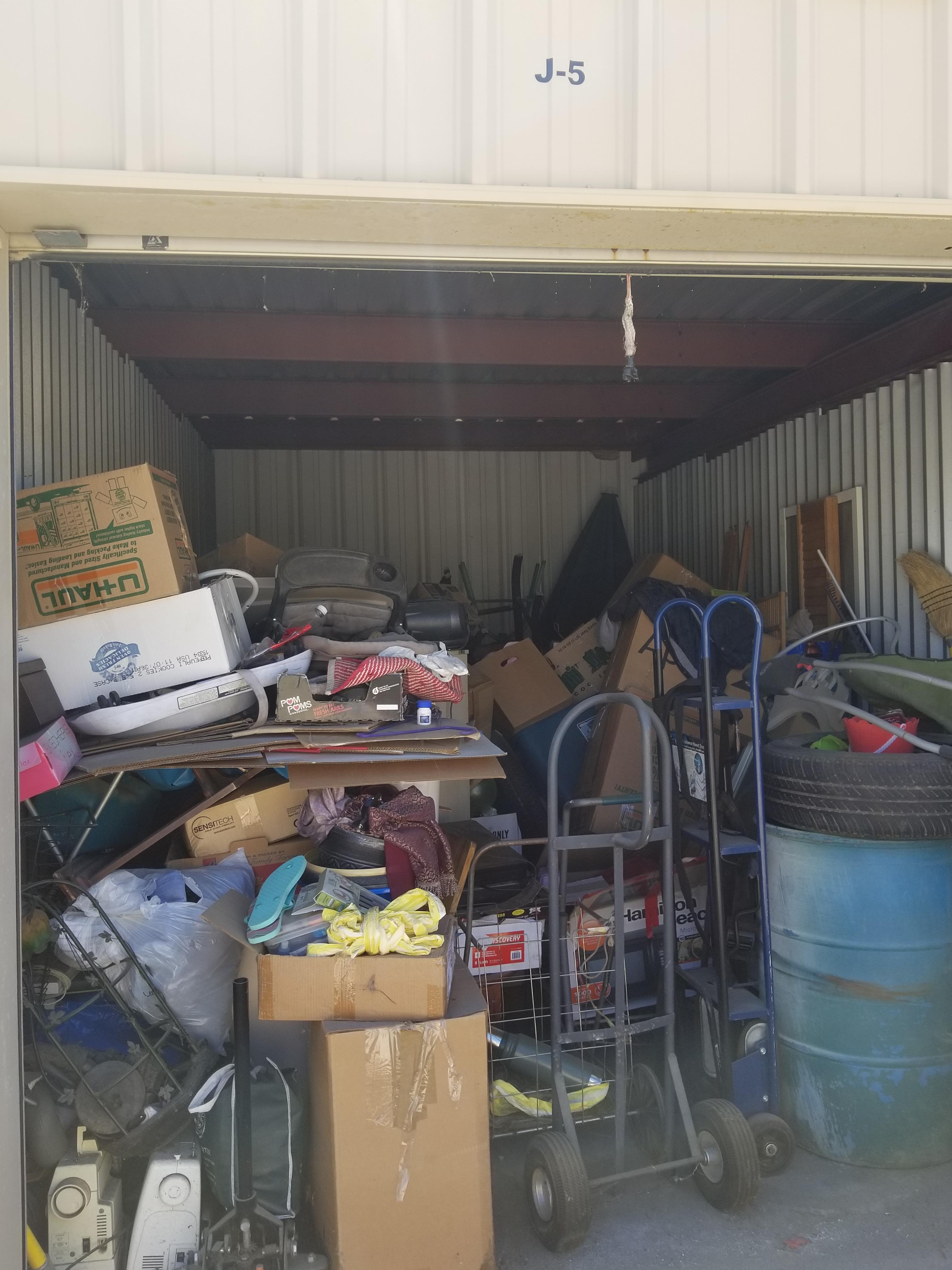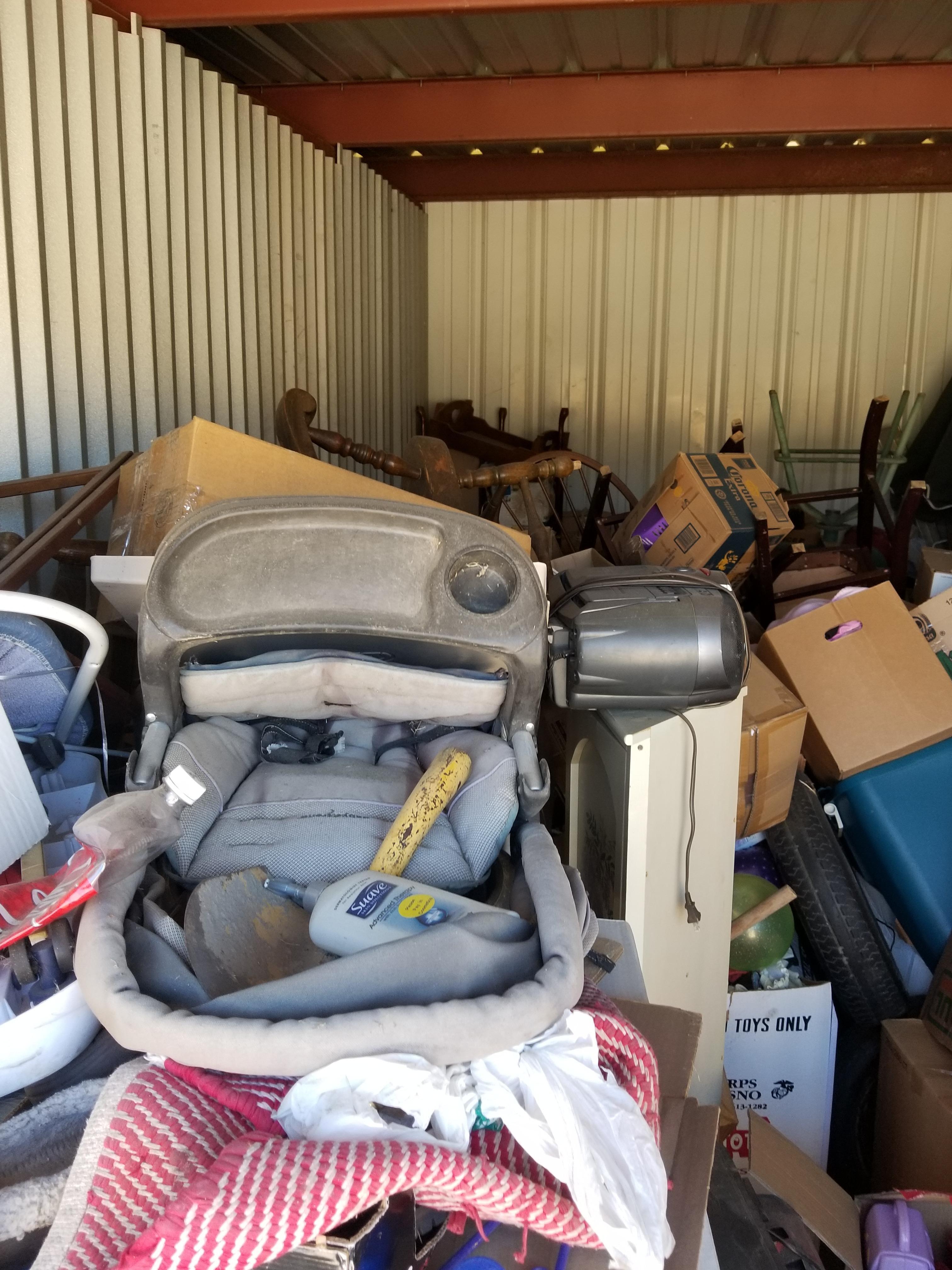 Unit appear to have: boxes, household furniture, moving supplies, outdoor items, tires, baby items.