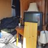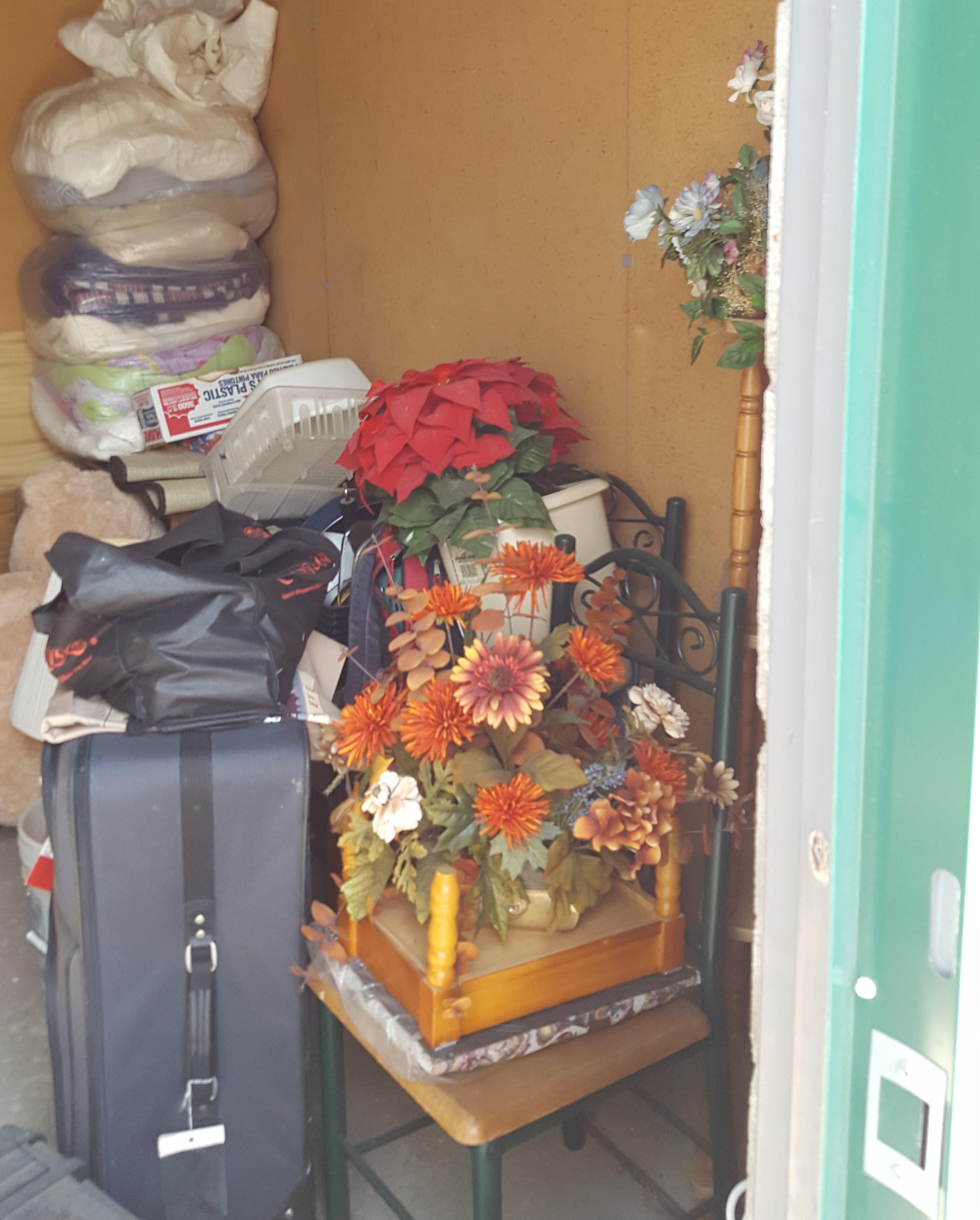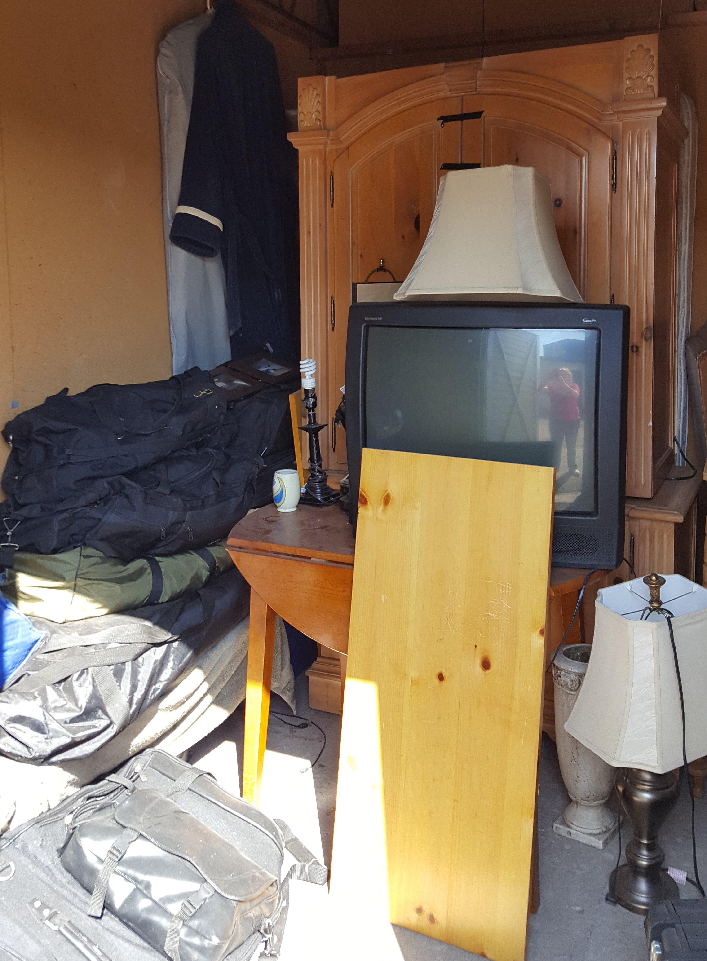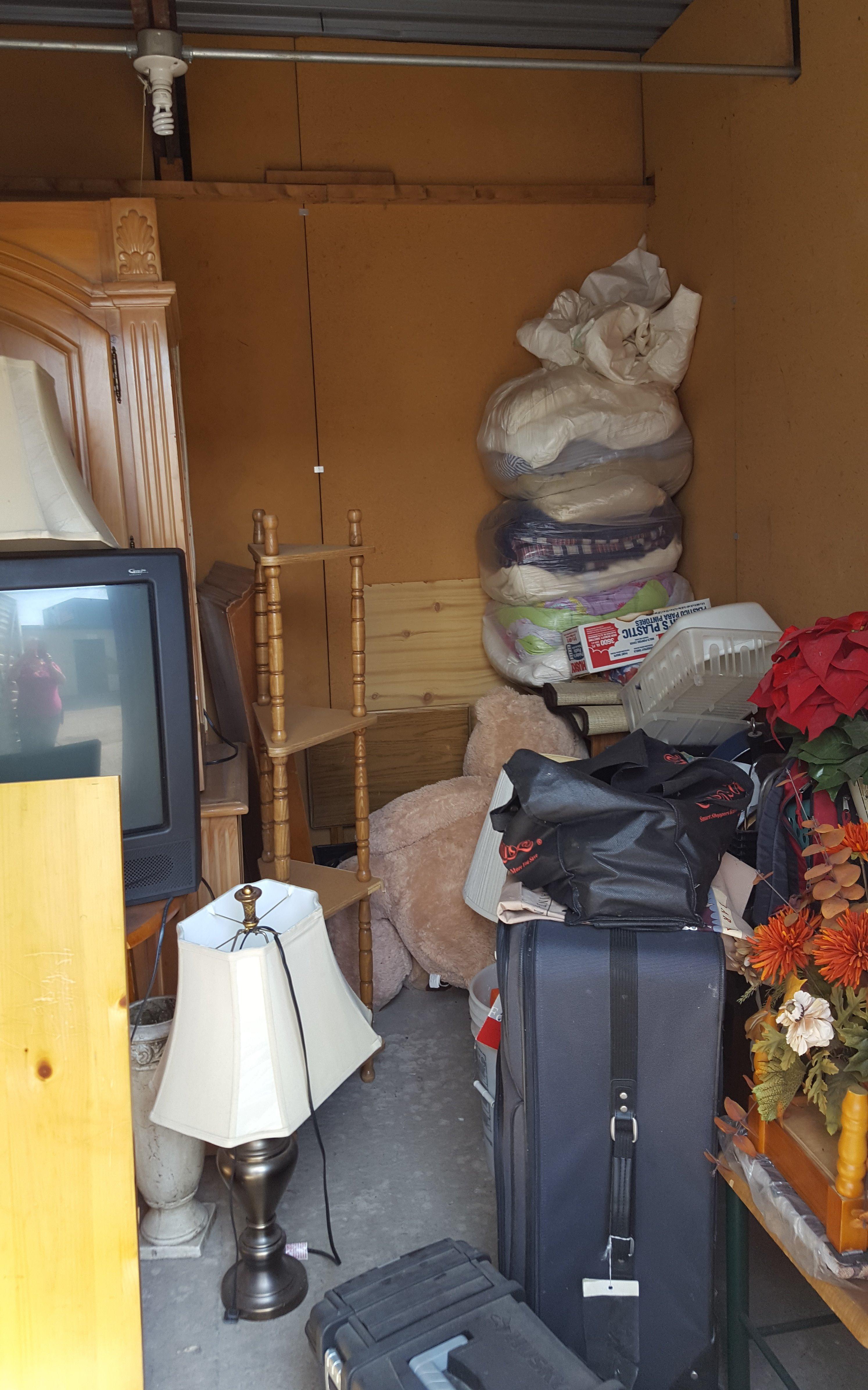 Unit has garment bags, entertainment center, tv, speakers, cd`s, lamps, table and chairs and toolbox. Has some Misc. items unit was organized.