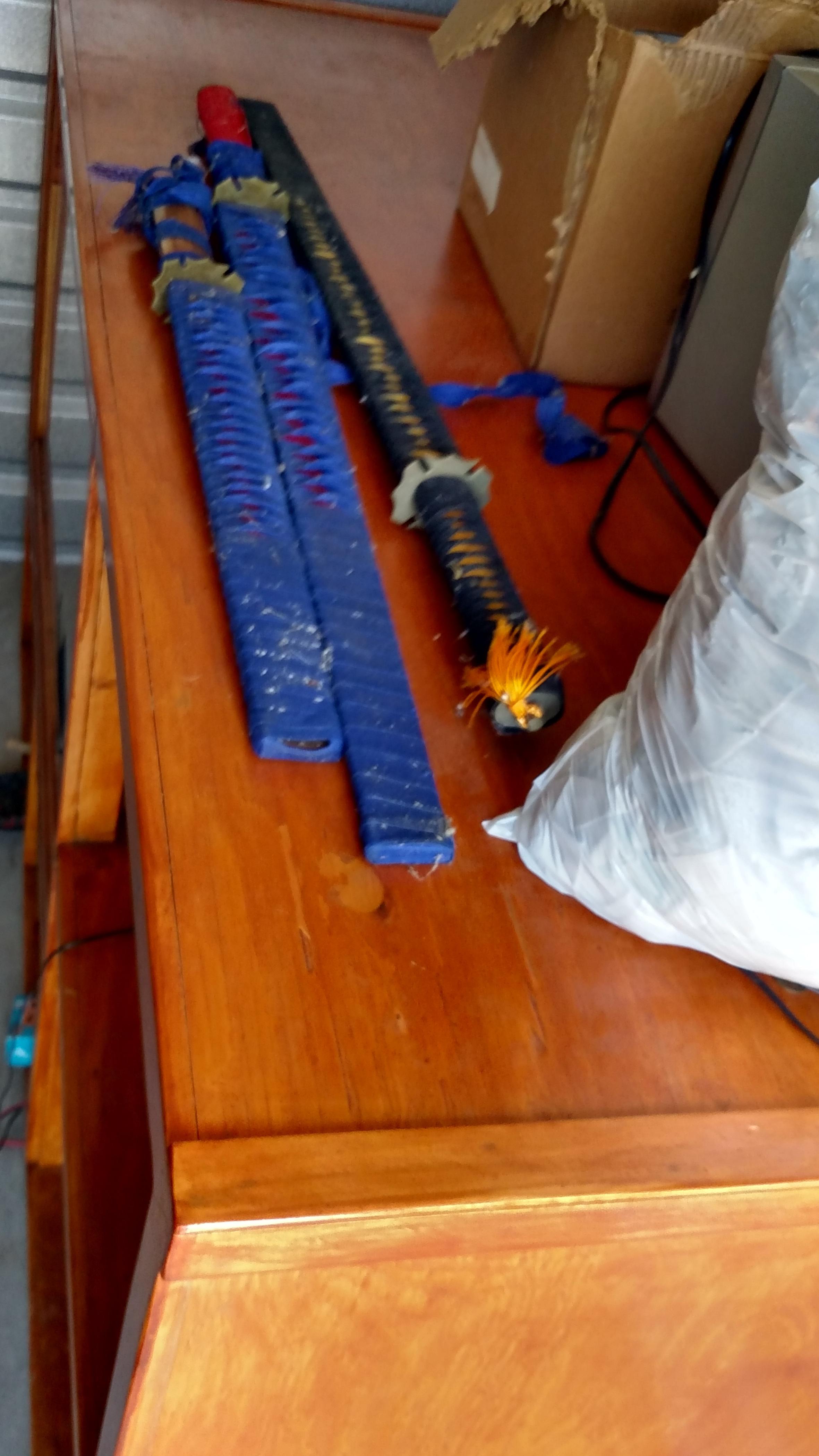 clothing, monitor, swords, table, keyboard, sub woofer, stereo table, Armour.