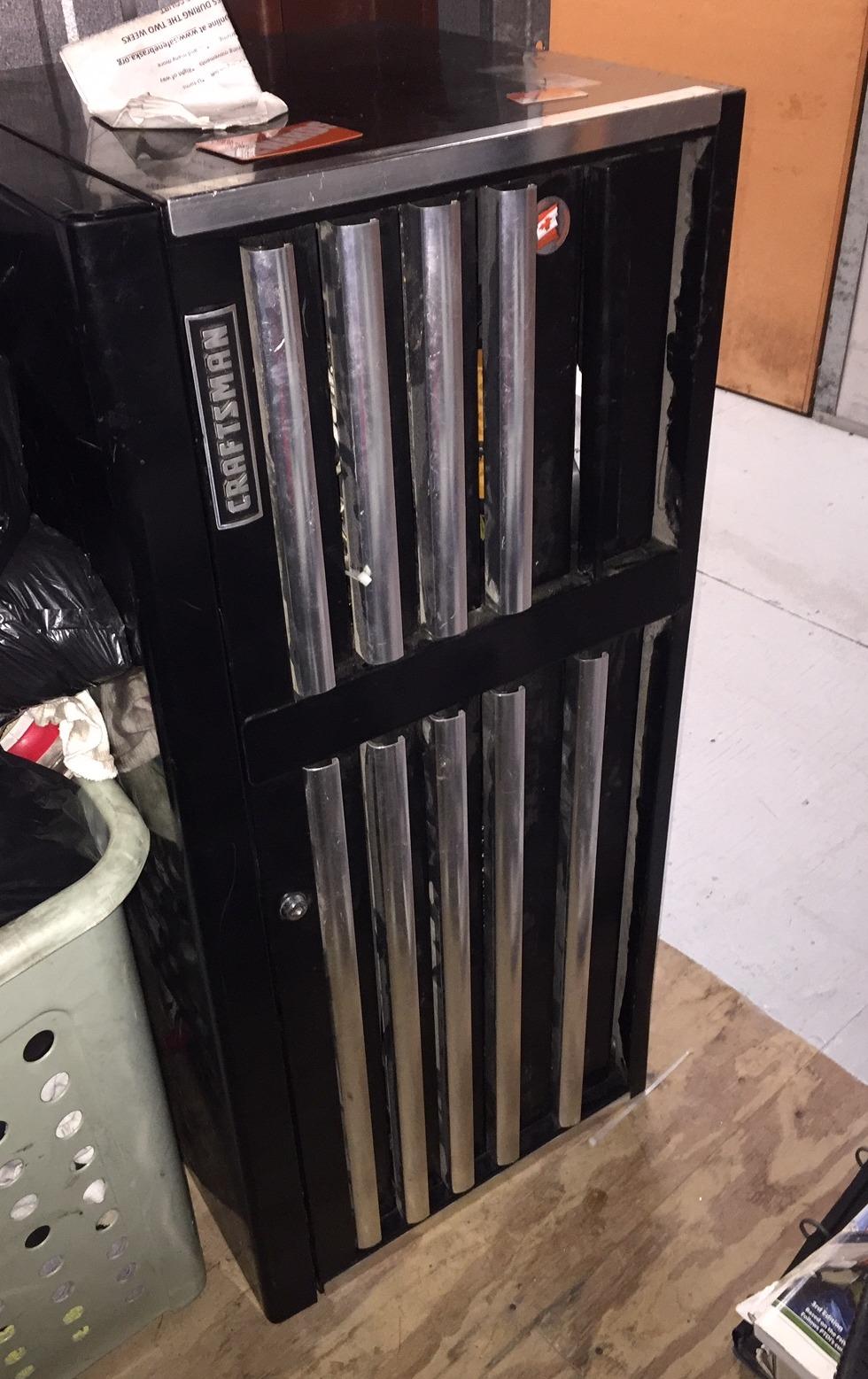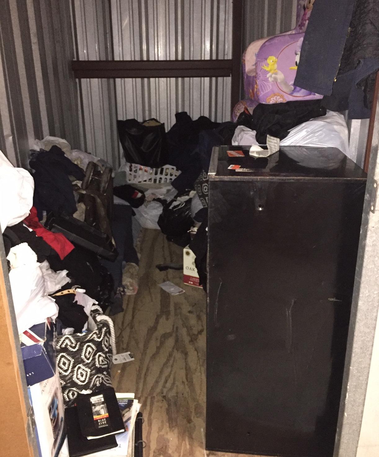This is a 5x10 unit with lots of clothes but has a Craftman Tool chest, baby stroller, 2 cute mini mouse chairs, and what appears to be a controller to a gaming station- who knows!