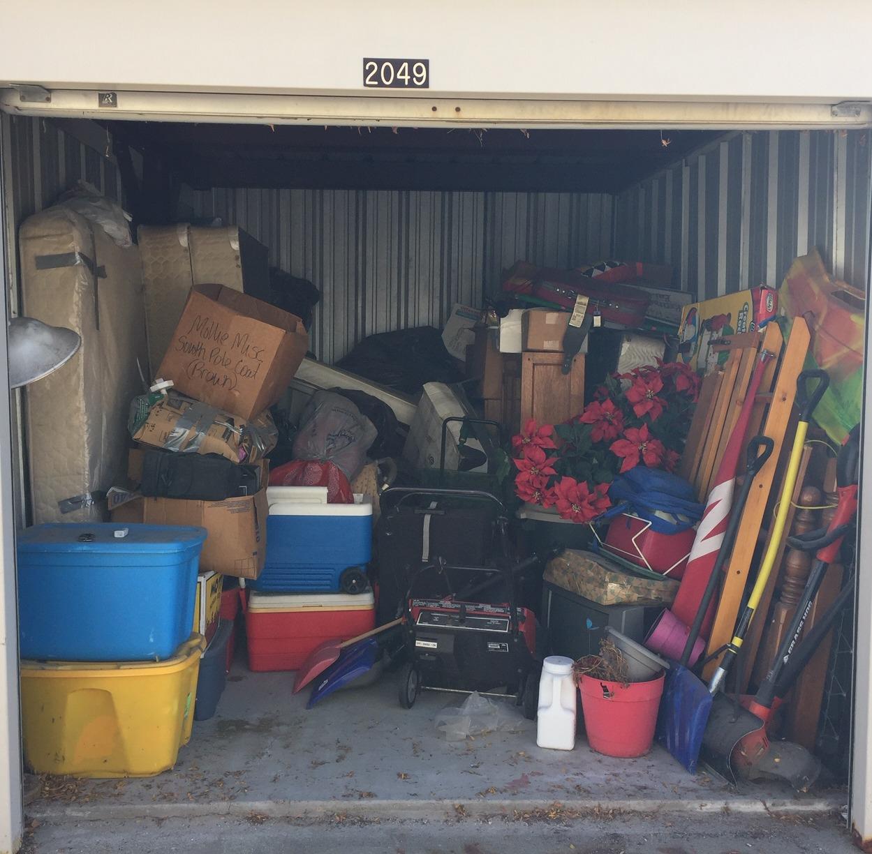 This is a 10x15 unit that is almost completely full! Bed frames, mattress's, curio cabinet, snow blower, baby stroller, 2 sets of golf clubs, kids toys, TV, Nebraska flag, igloo coolers,luggage, an lots of boxes and storage tubs