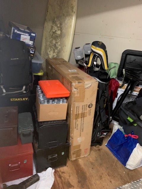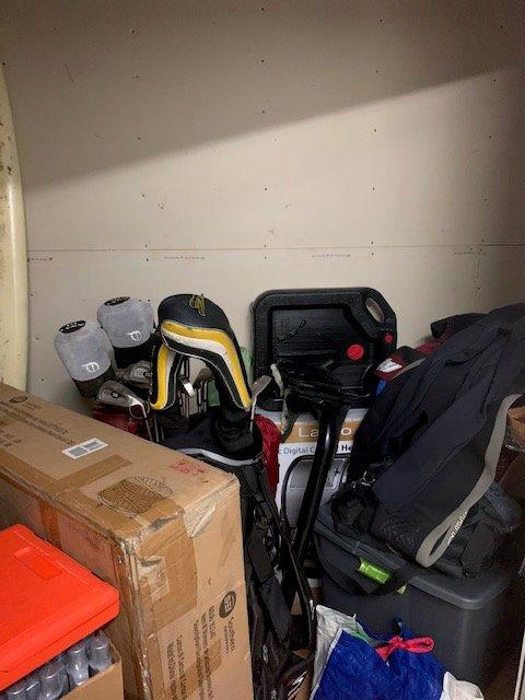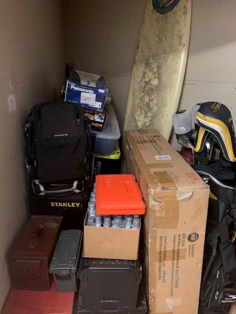 Golf Clubs, Sports Equipment, surfboard, tools, camping gear, misc bins,