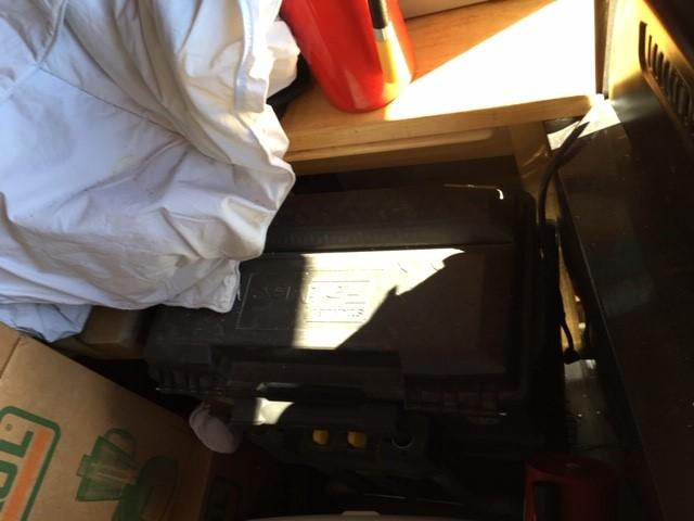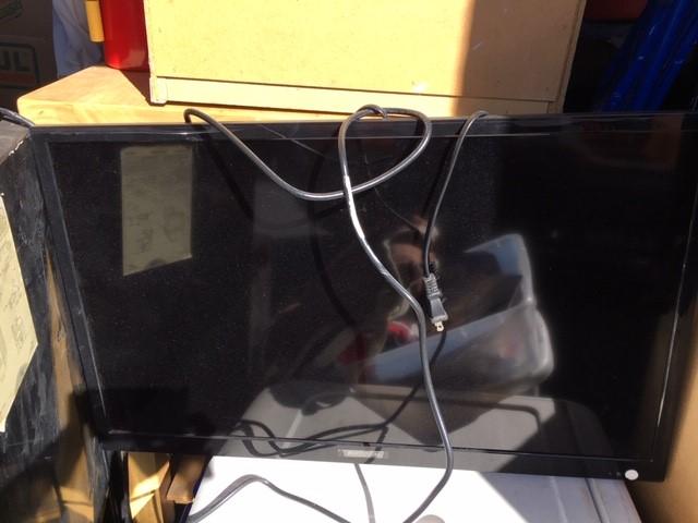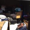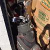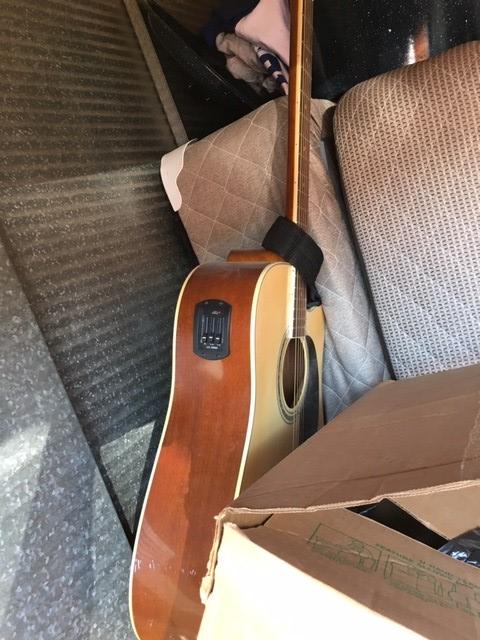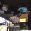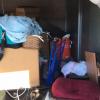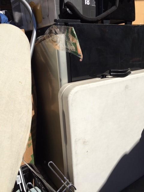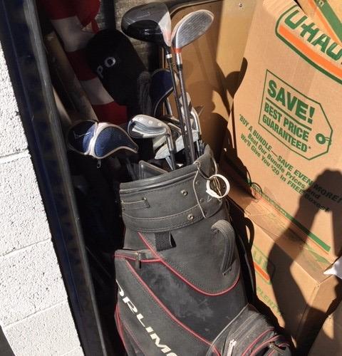 Appears to contain: Set of Golf Clubs, Portable folding Table, Misc Personal Items, Guitar, Flat Screen Tv, Mini Fridge, Boxes, Household items