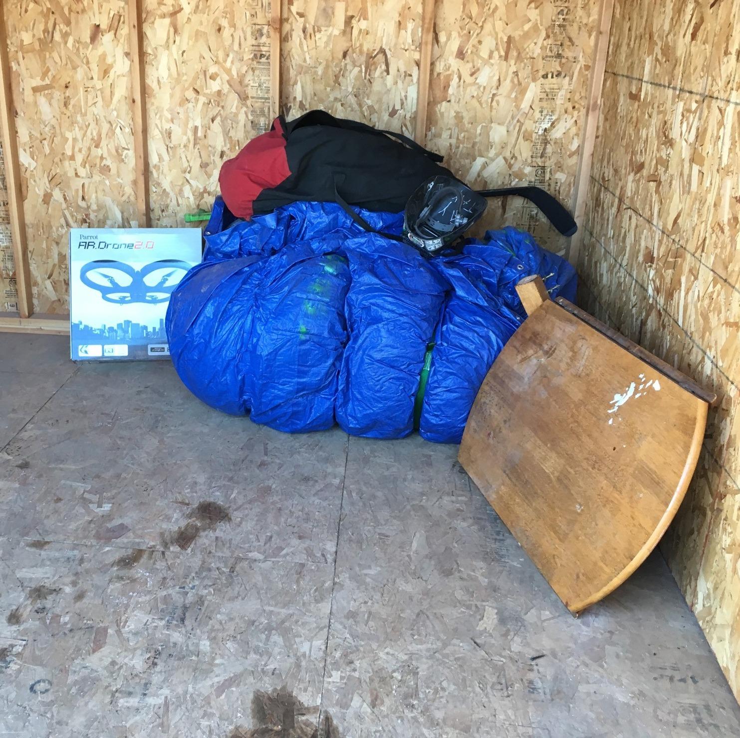 Drone, hockey equipment, large tarp, table.