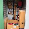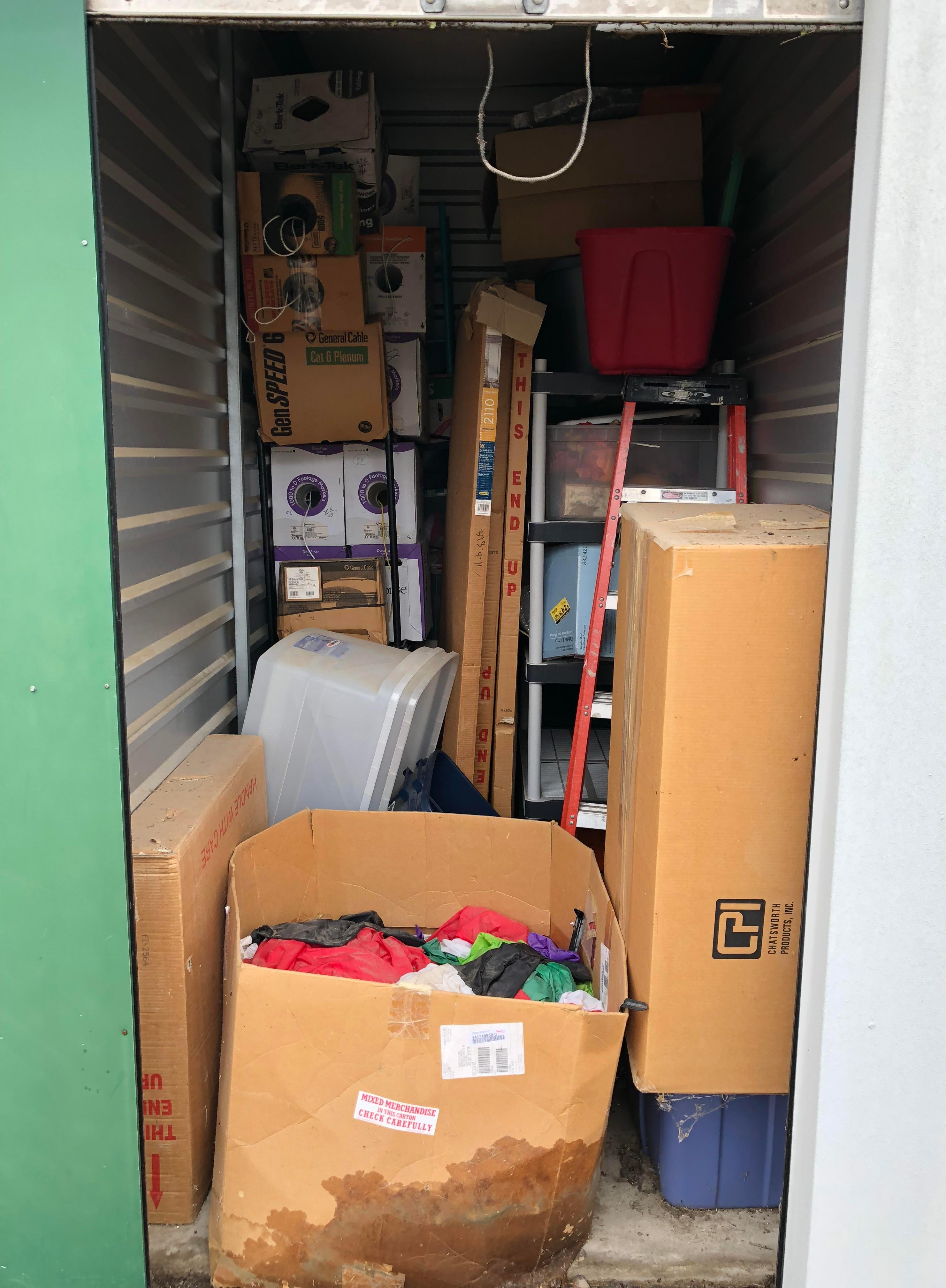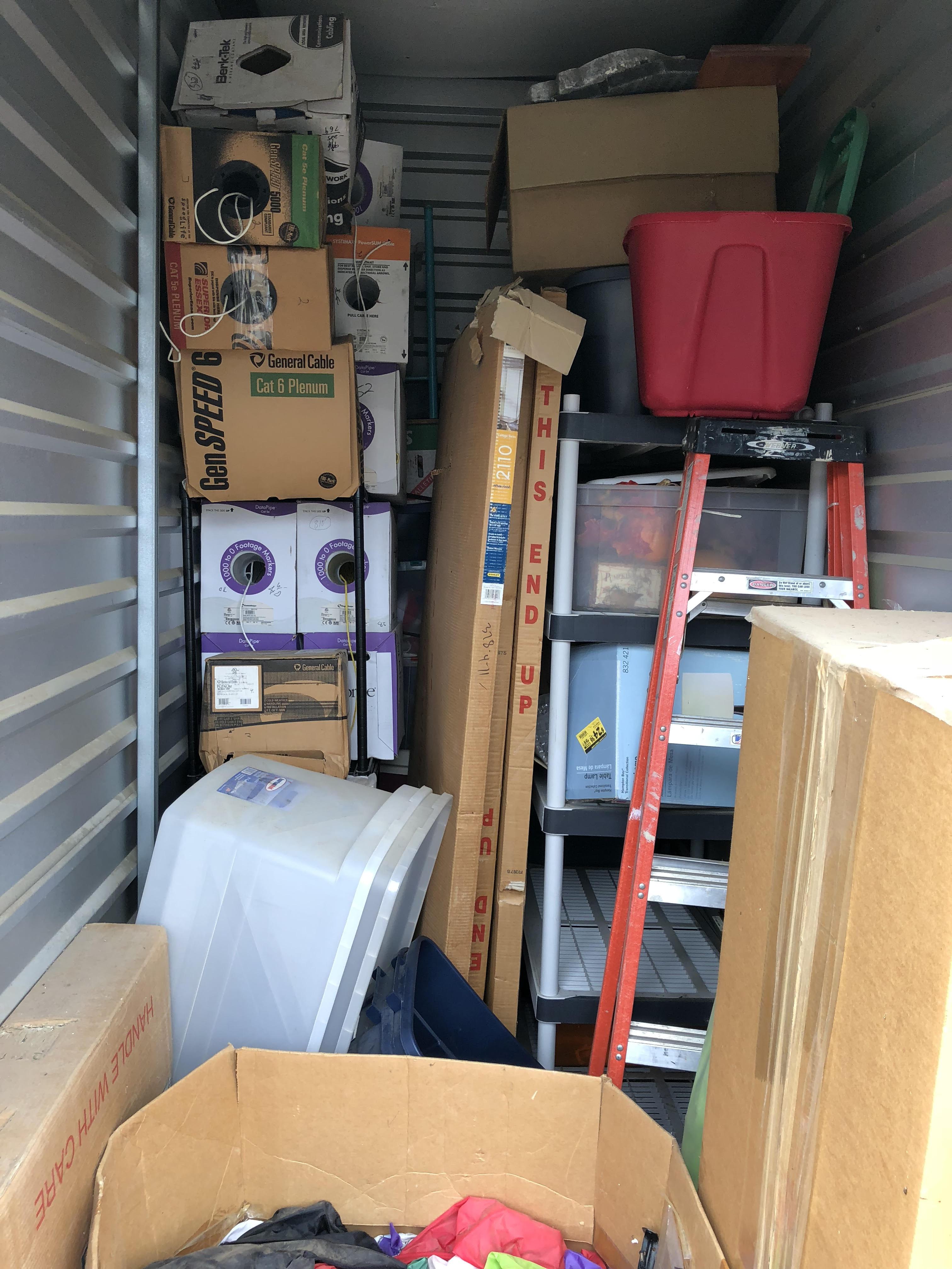 Storage racks, ladder, misc holiday decorations, folding tables.