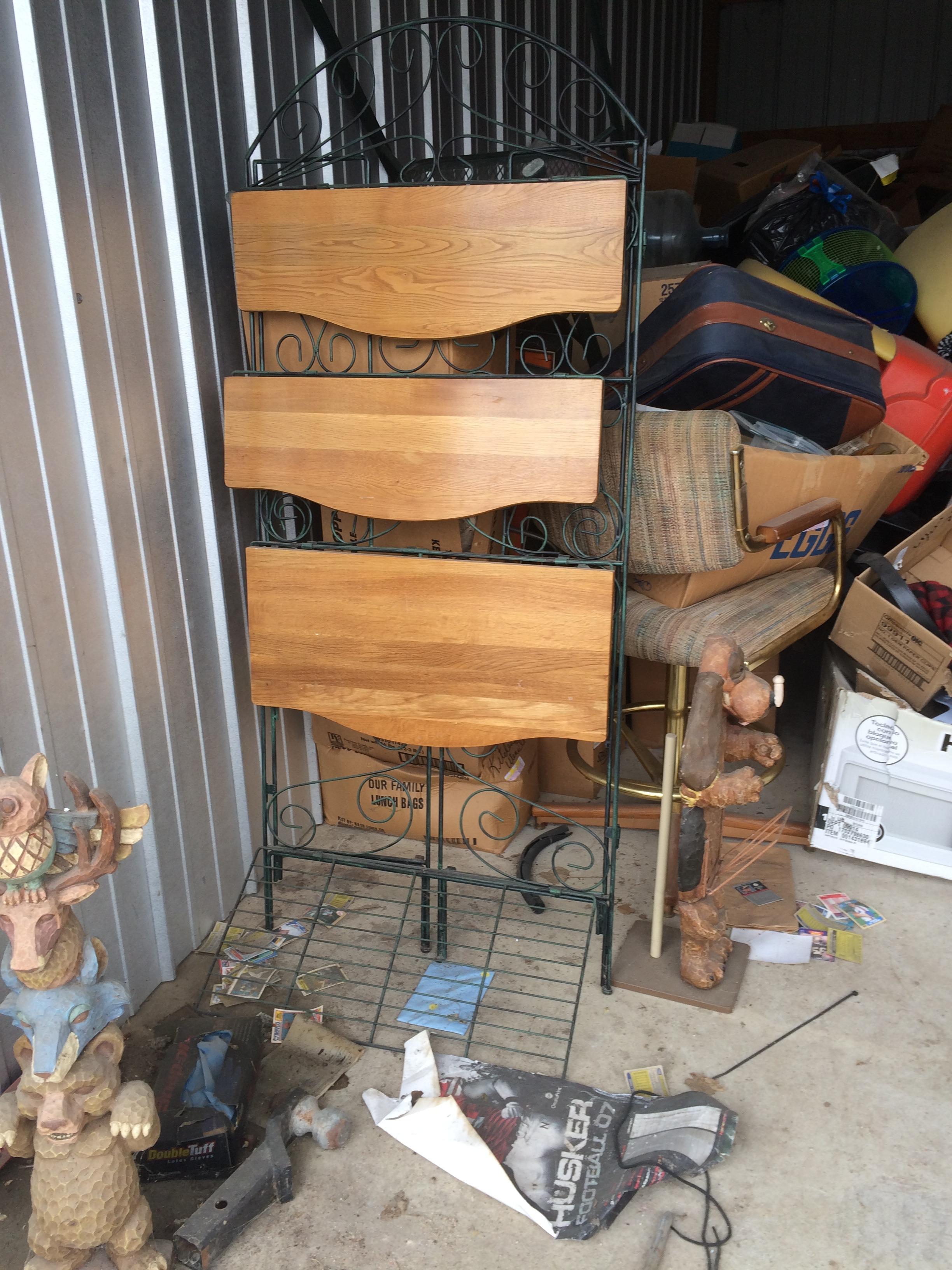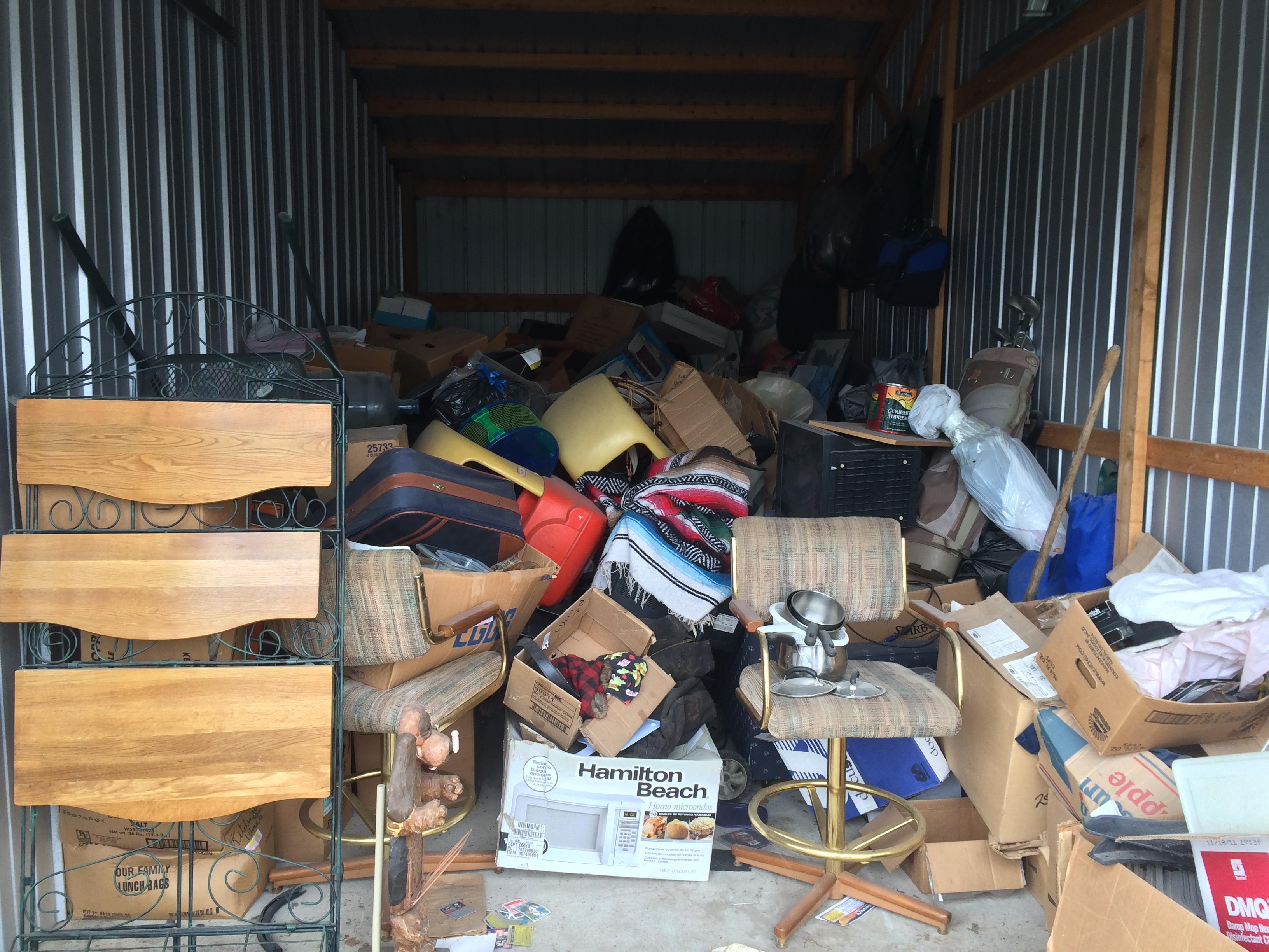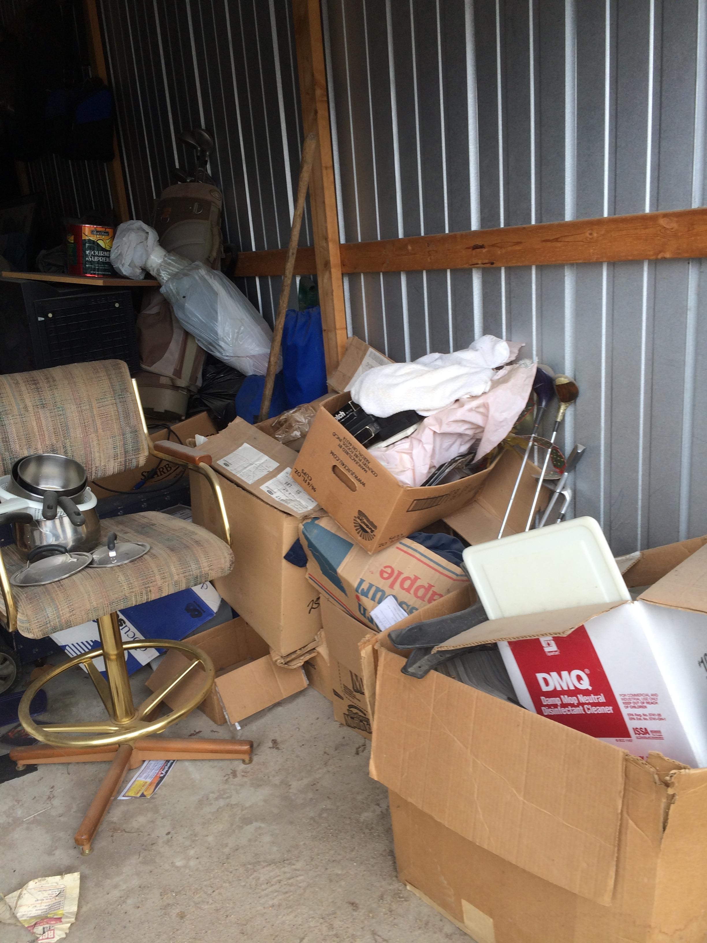 This is a very large 10x24 unit with a lot of stuff in it. Golf clubs, golf bag, VHS tapes, trailer hitch, bar chairs, wood/metal shelf, kids plastic cars, cooking pots, boxes full of clothes.