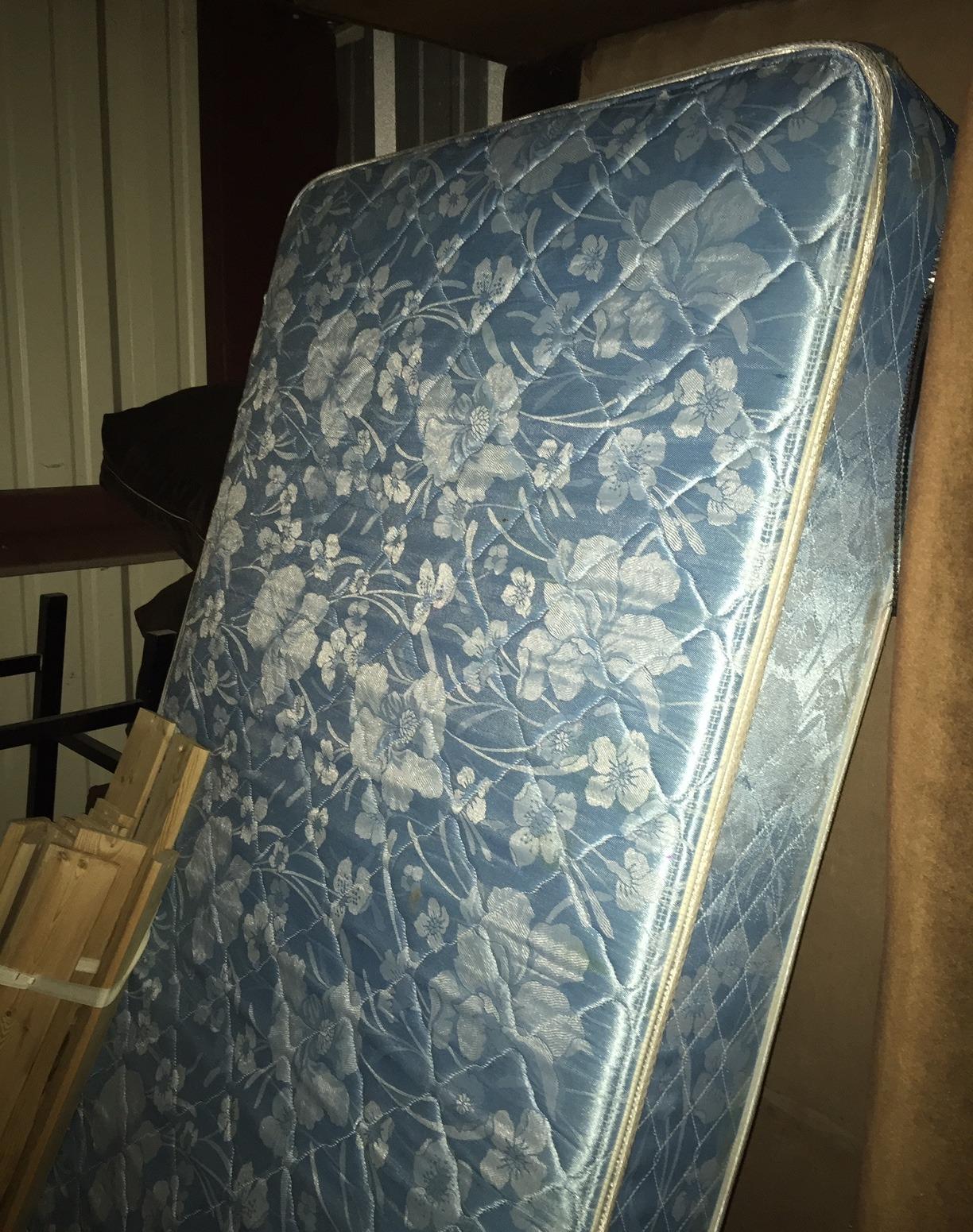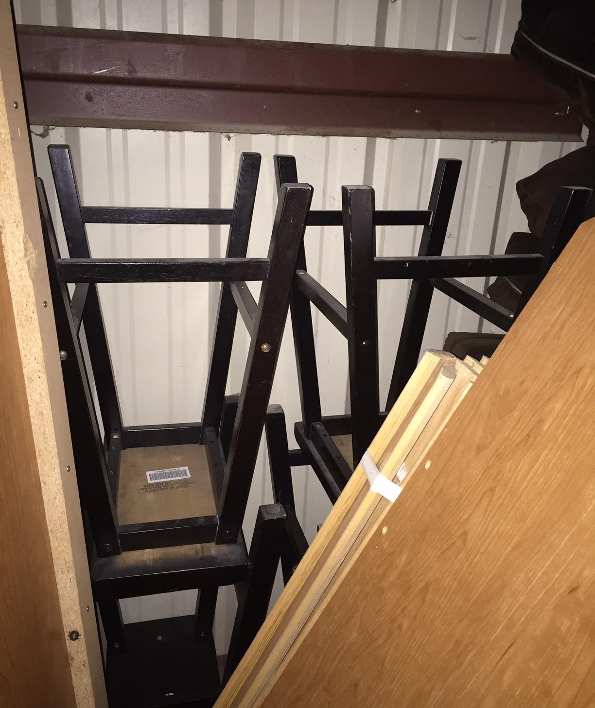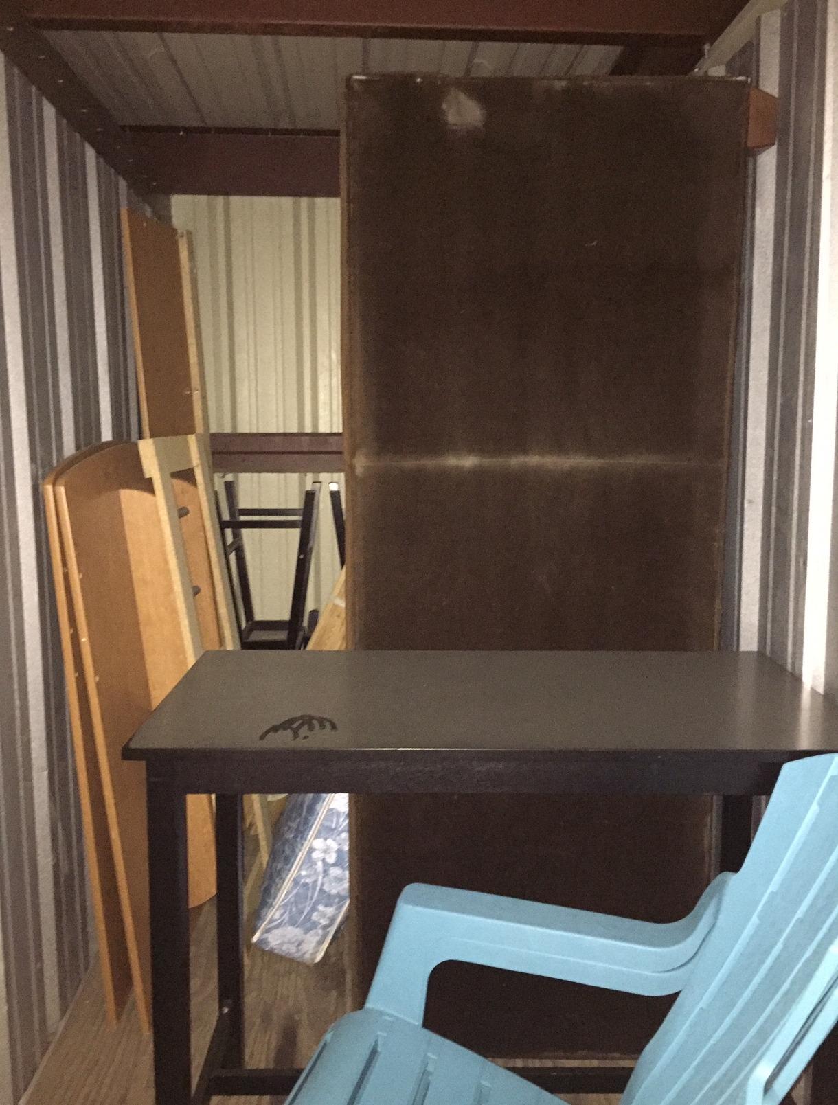 This unit has a nice tall dark wood kitchen table with 4 bar stools, 2 adirondak chairs, a couch, a twin mattress, and a bed frame
