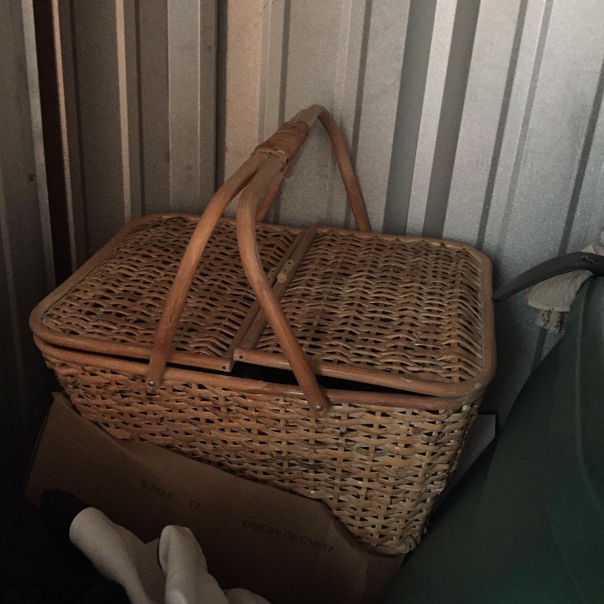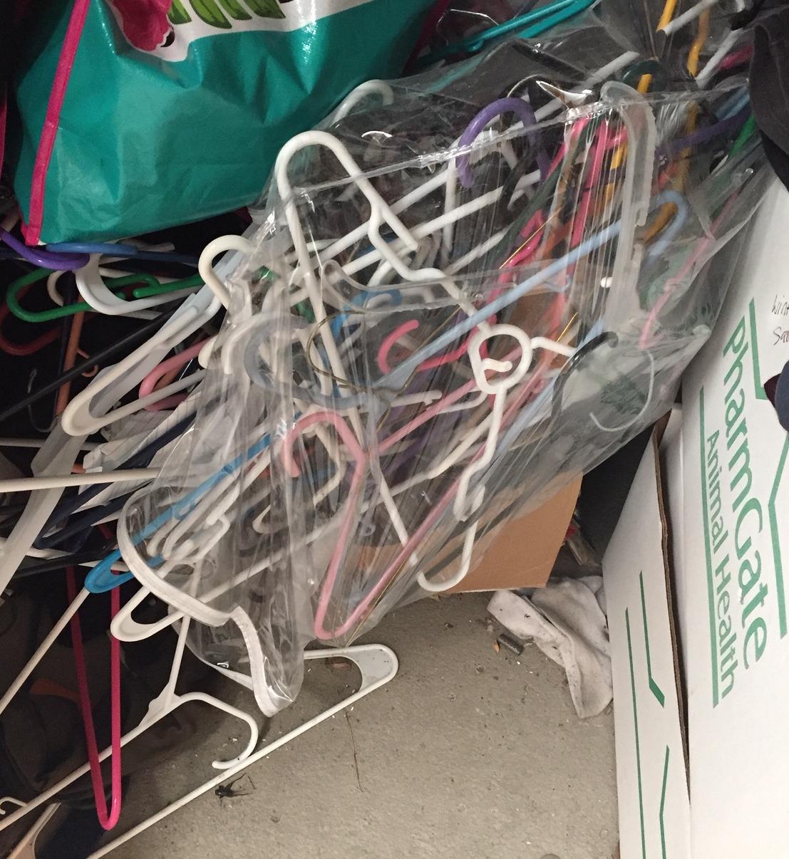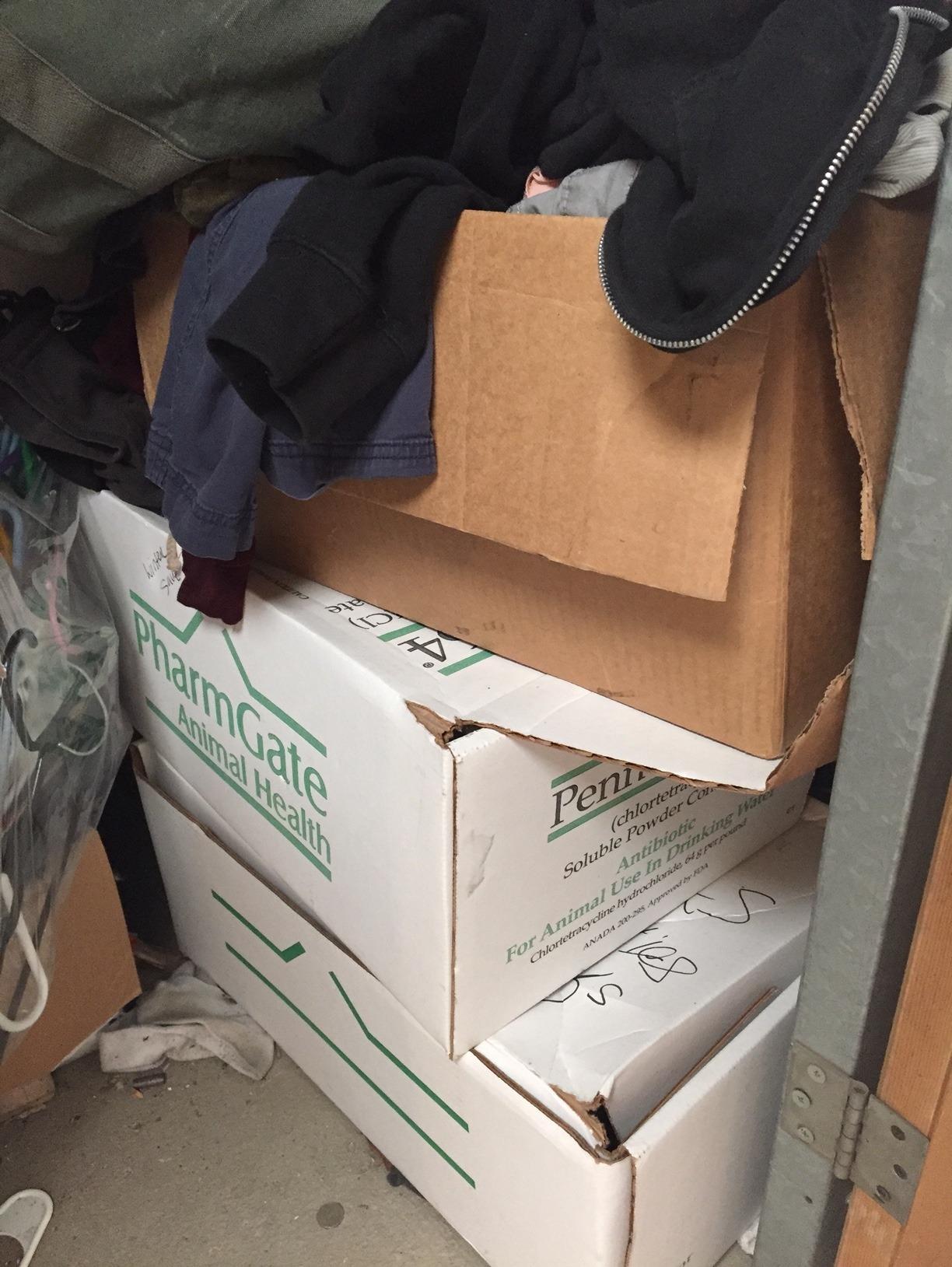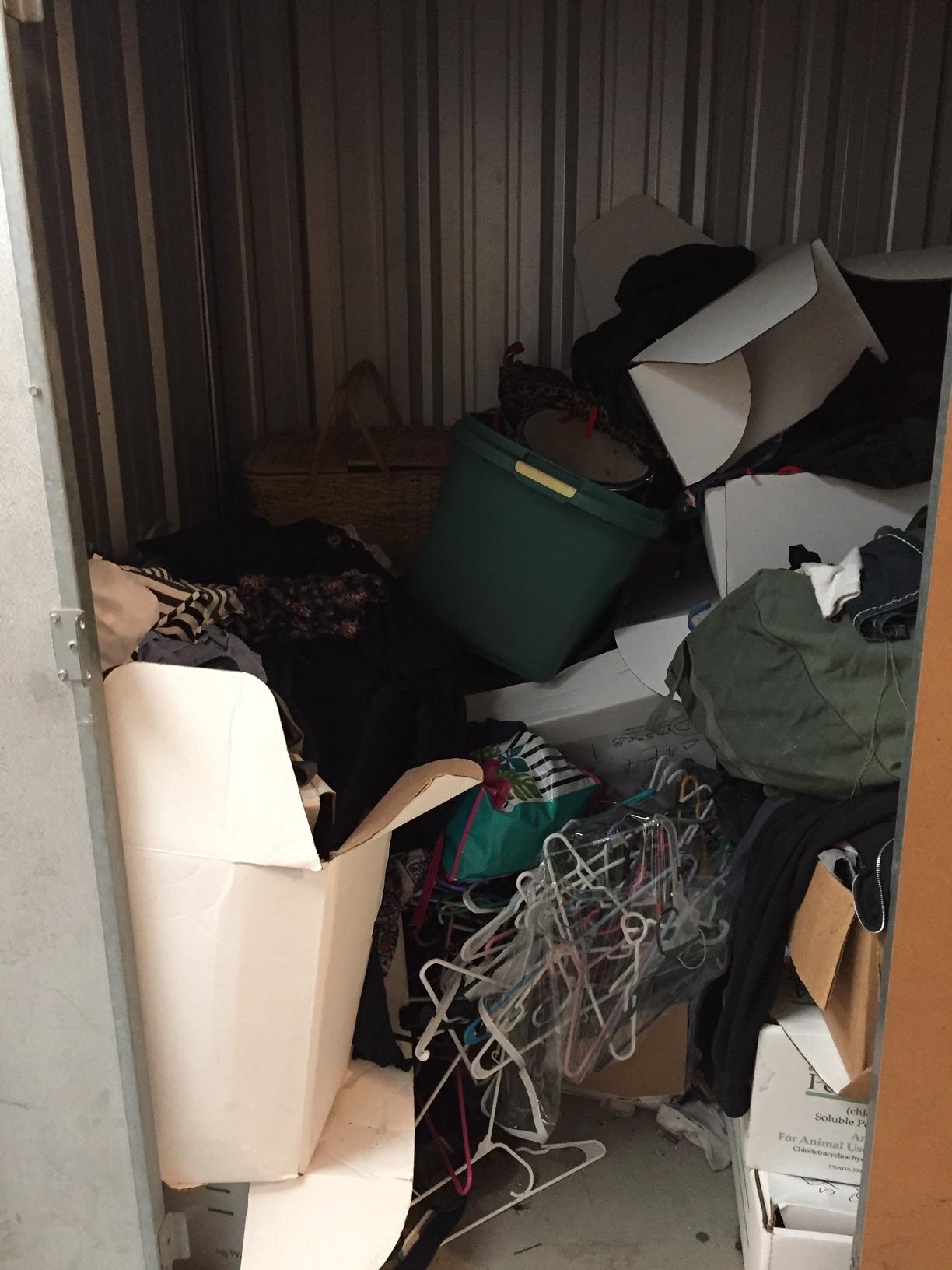 Lots of clothing in this unit along with unopened boxes, totes, a wicker basket, hangers, and a drum