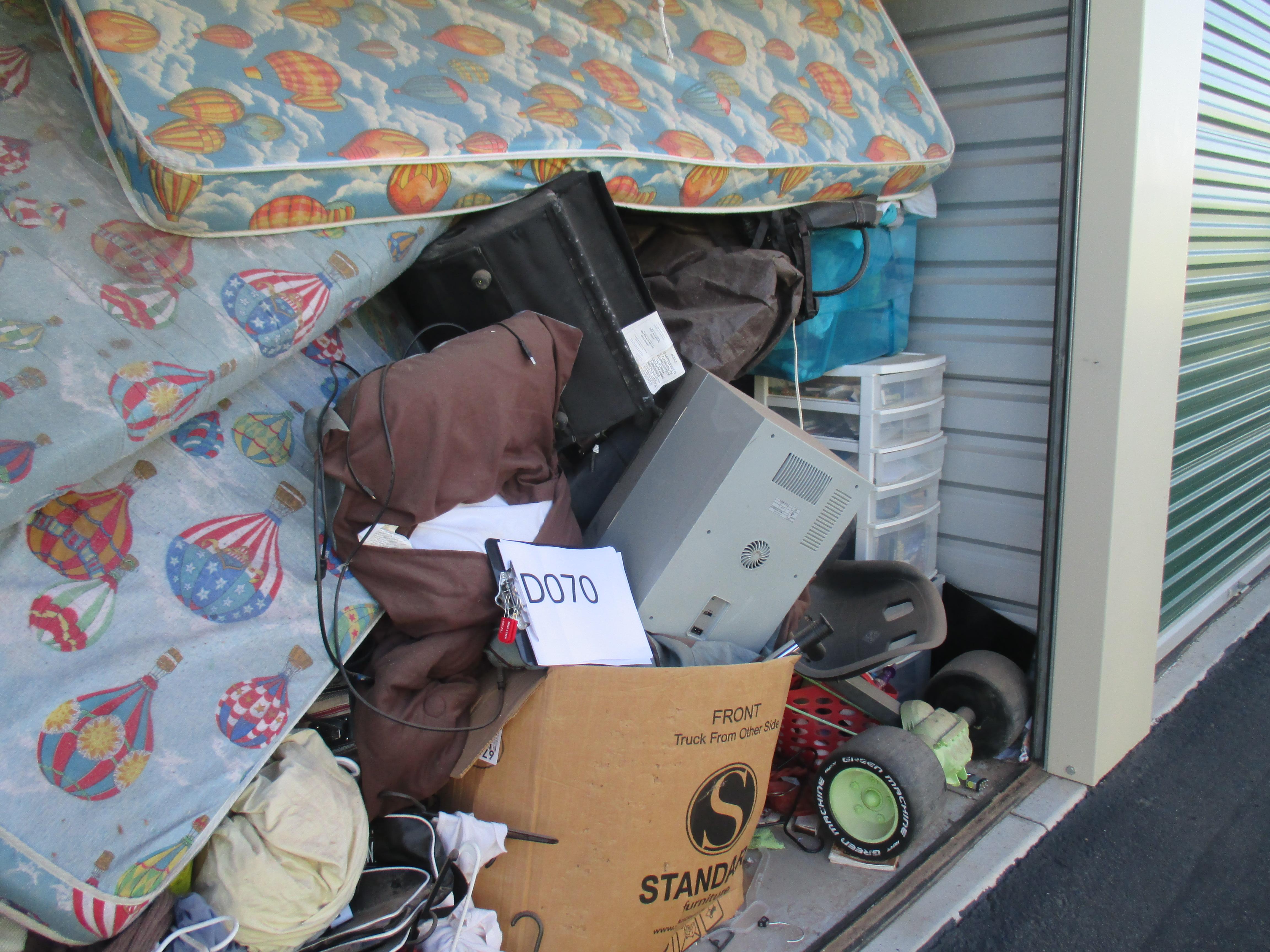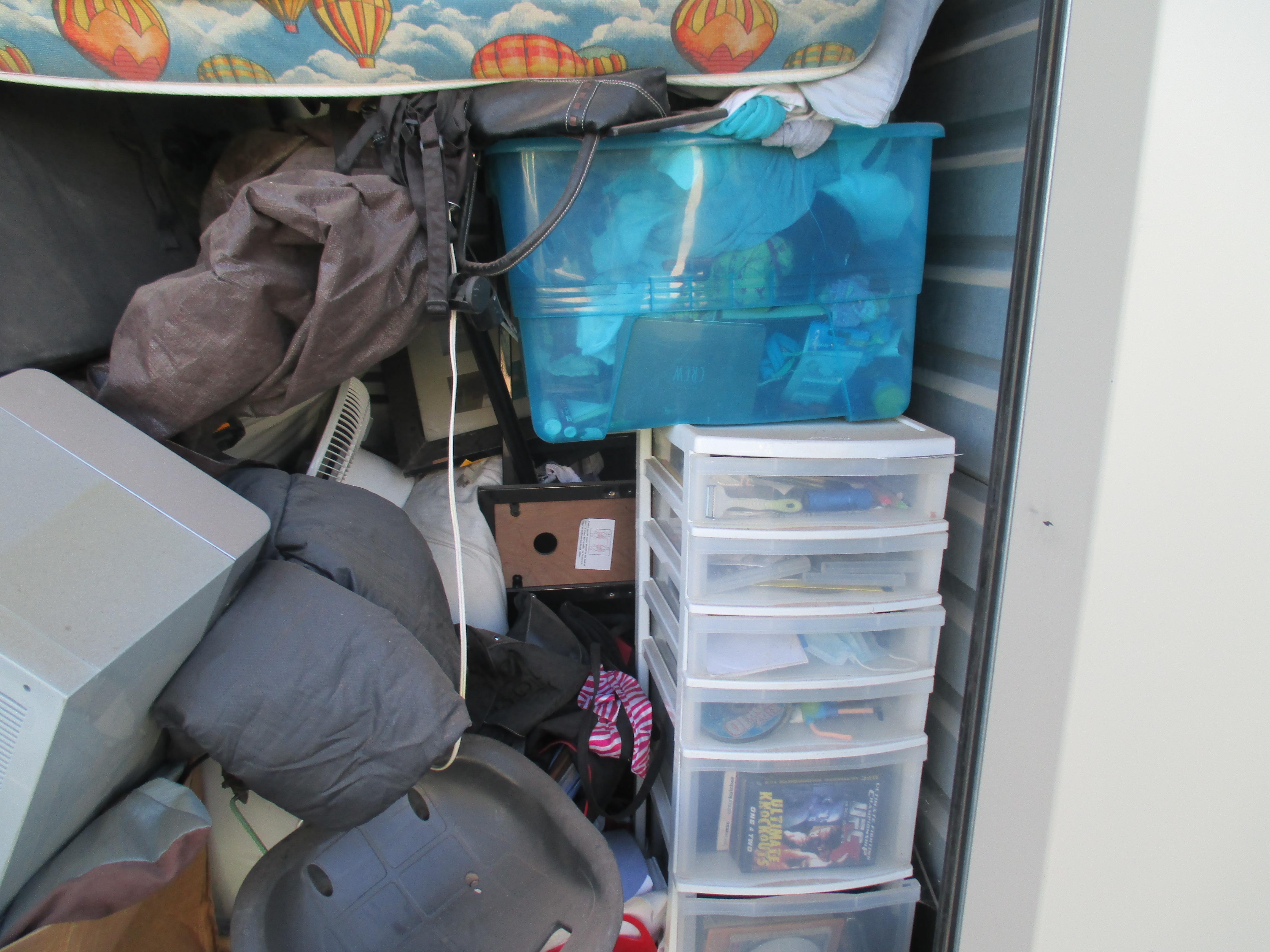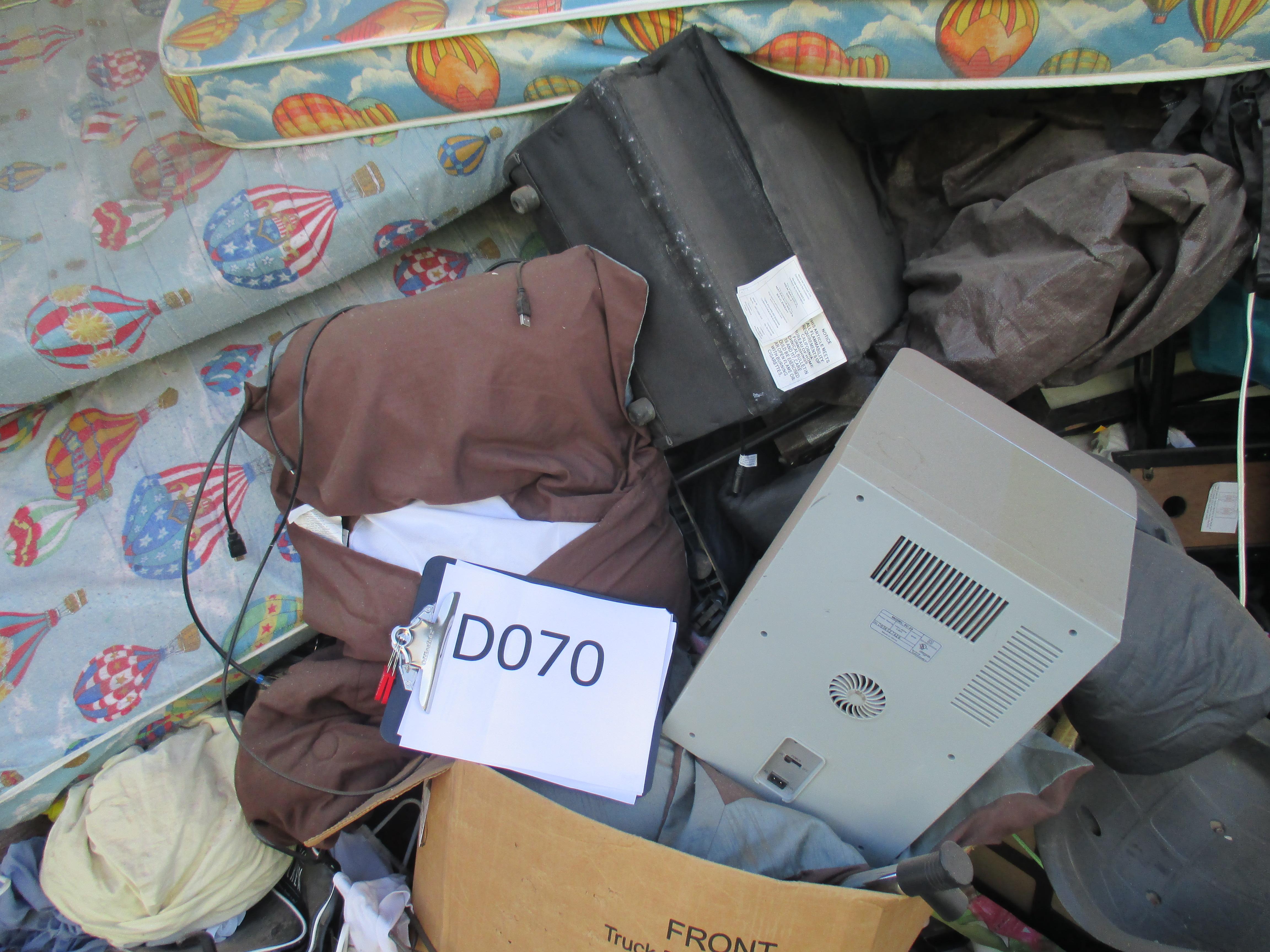 Misc. Baby Items, Blanket, Boxes, Books, Adult Clothing, Fan, Luggage, Mattress (Small/Youth), Plastic Containers, Childs Toy, Knee Board, Purse, TV Stand.