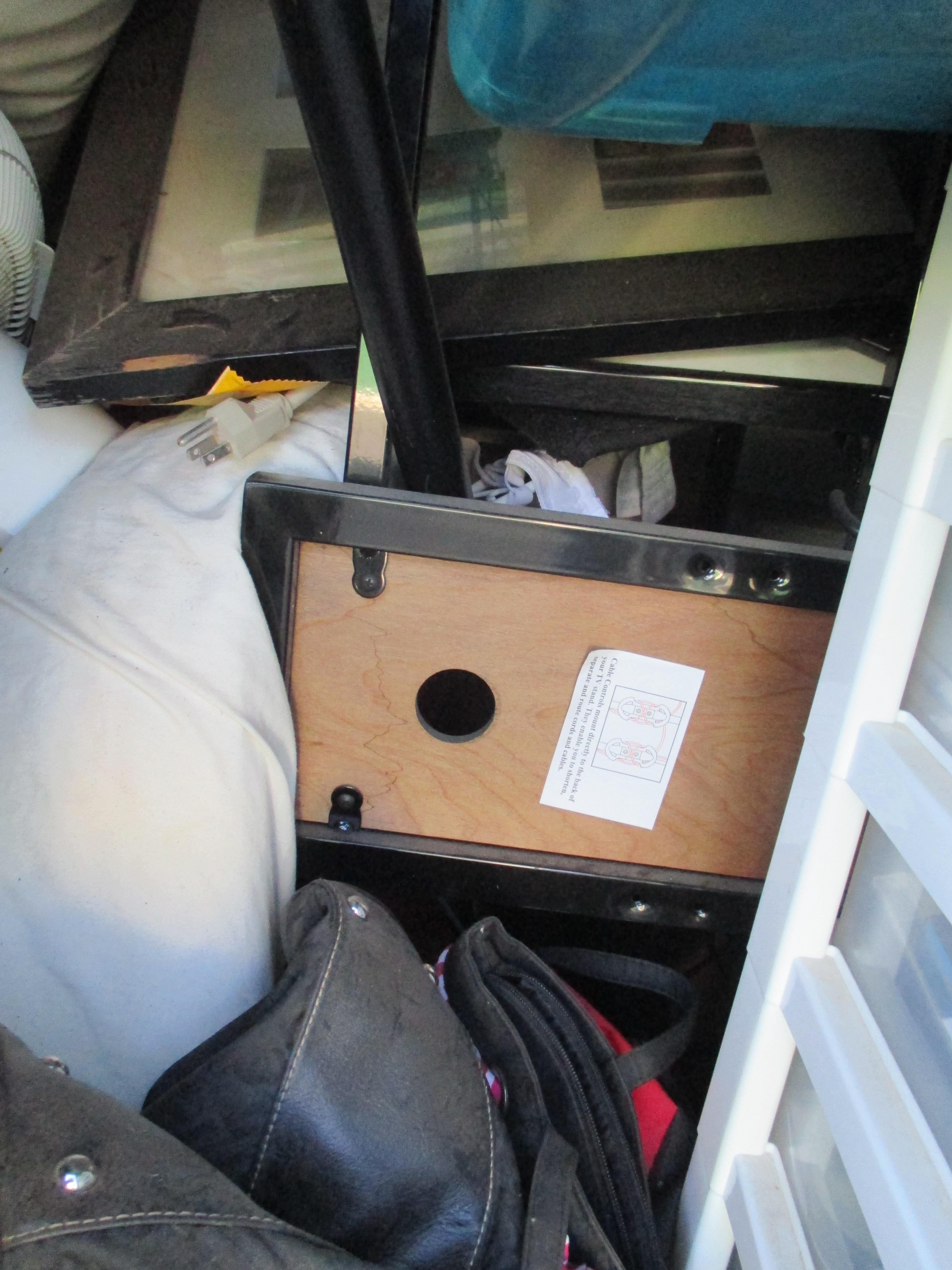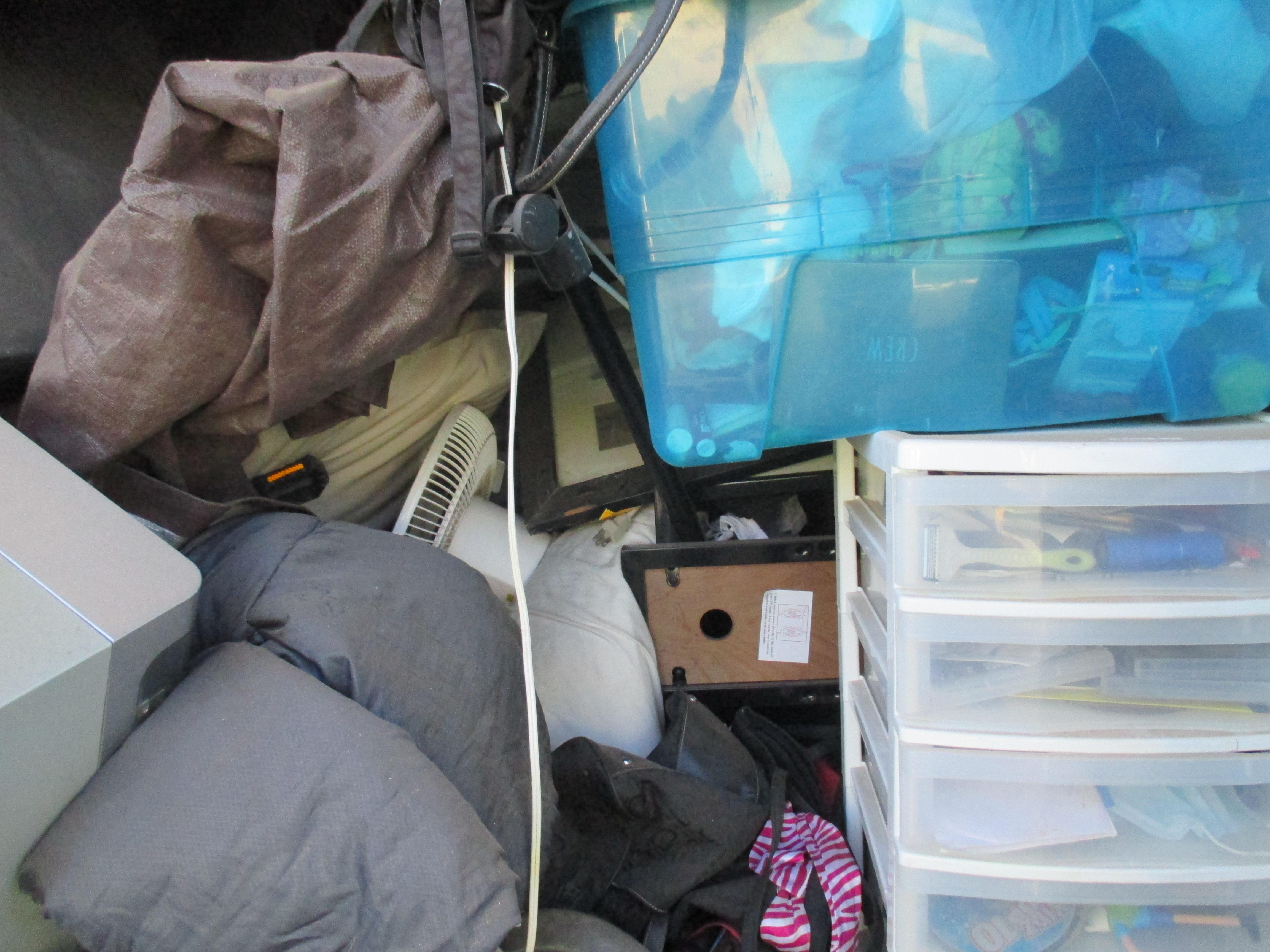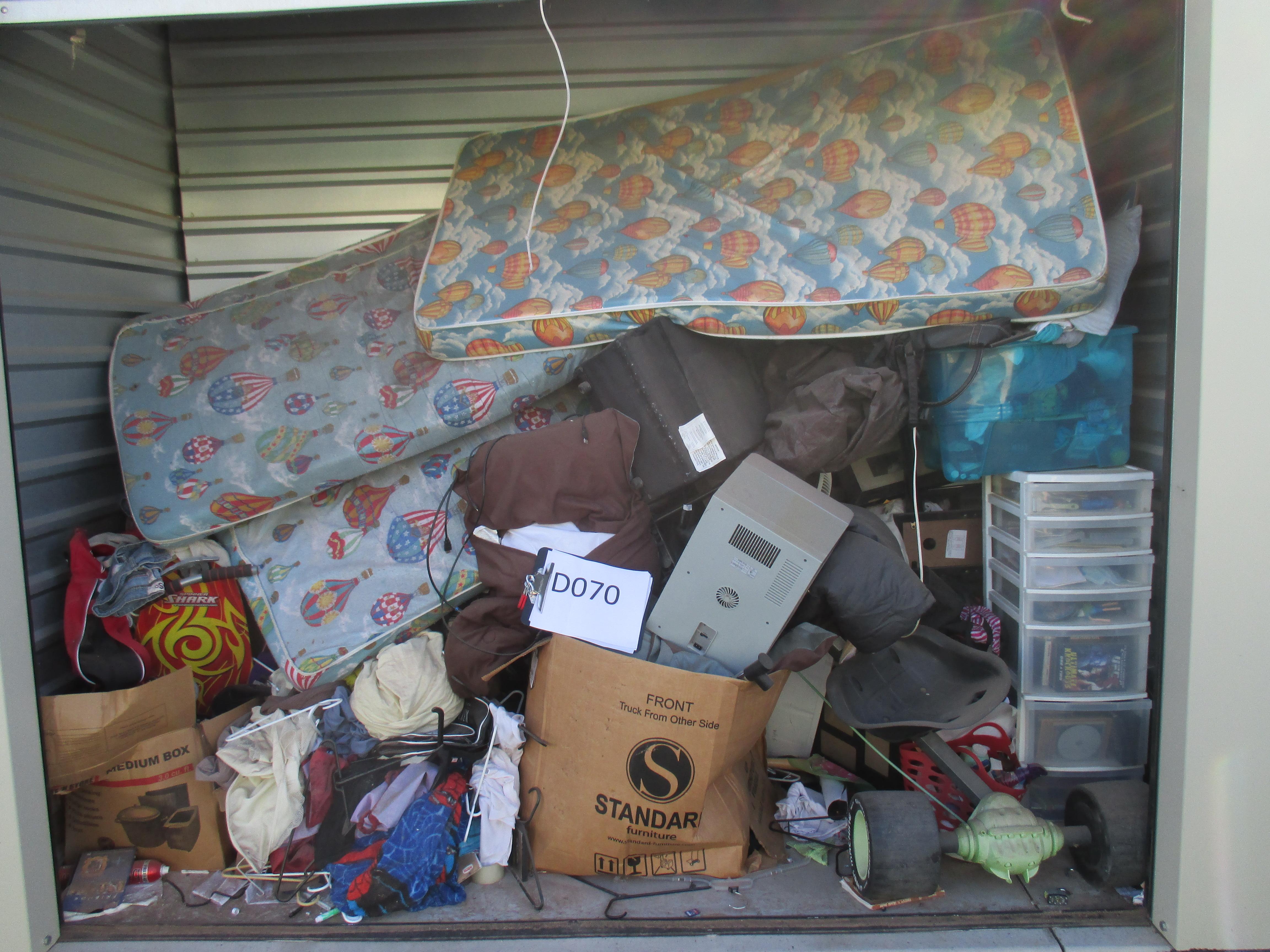 Misc. Baby Items, Blanket, Boxes, Books, Adult Clothing, Fan, Luggage, Mattress (Small/Youth), Plastic Containers, Childs Toy, Knee Board, Purse, TV Stand.