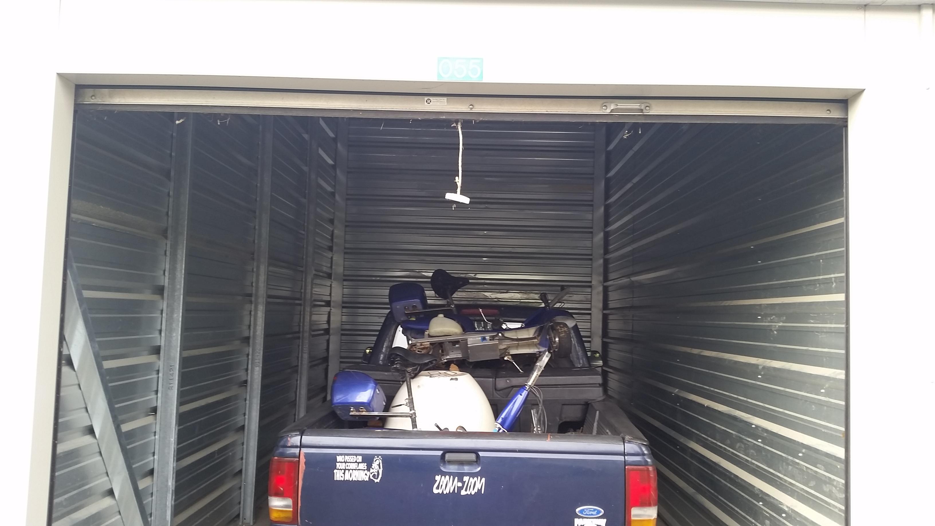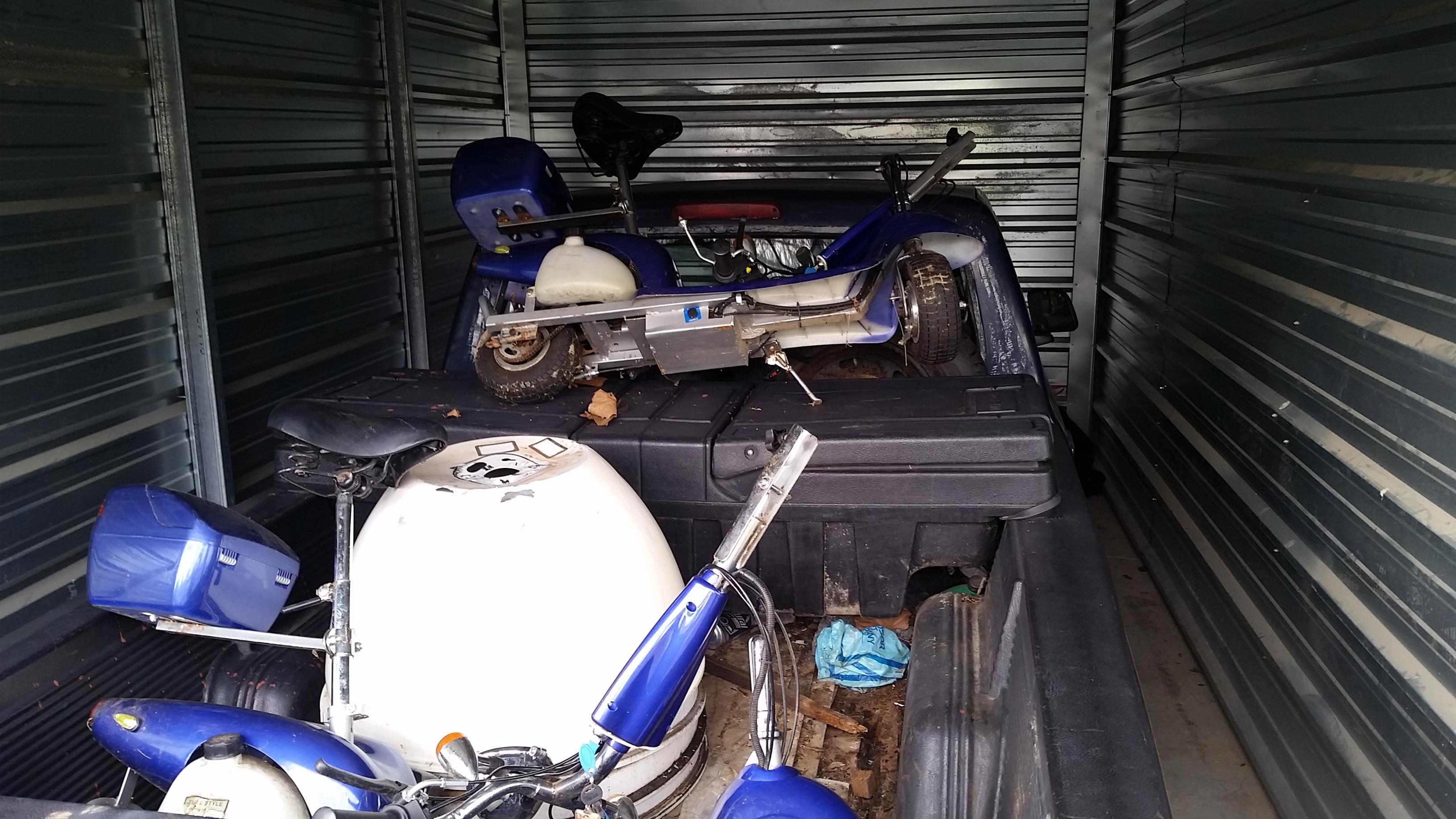 This is a 10x20 unit containing a small pickup truck and some scooters.