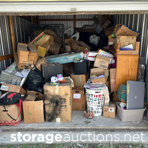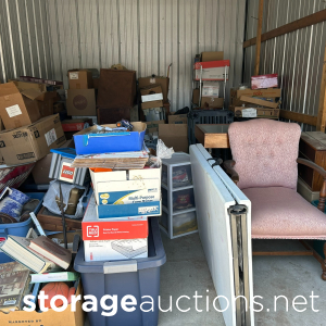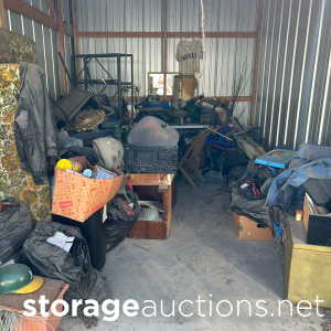 This is a very large 10x24 unit with a lot of stuff in it. Golf clubs, golf bag, VHS tapes, trailer hitch, bar chairs, wood/metal shelf, kids plastic cars, cooking pots, boxes full of clothes.