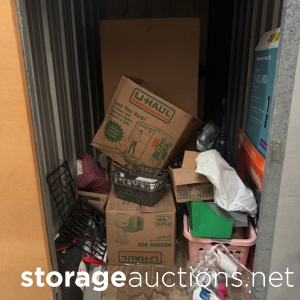THIS UNIT IS FULL AND WHAT WE CAN SEE IS - LOTS OF BOXES, COMPUTER CHAIR, LOOKS LIKE A CHEST OF SOME KIND, DORM FRIG, END TABLES, AND NEW IN THE BOX WINE CELLAR
