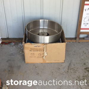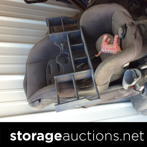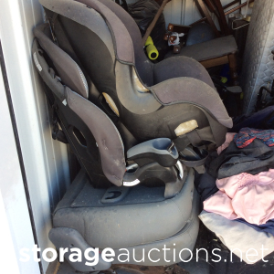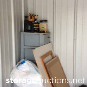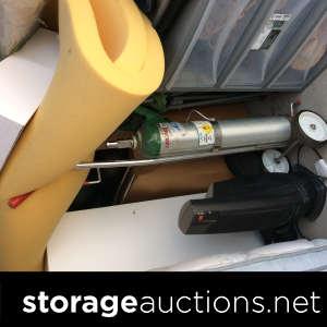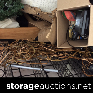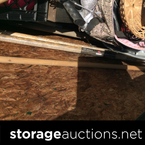 Swords, shovel, rake, garden hoes, Rural King battery, yard tools, several totes, decorative boxes, decorative metal shelf, two vacuum cleaner, weed eater, small metal toolbox, cooler, plastic shelf unit, bed frame?, headboard, child or pet gate, small chest of drawers, little wooden ladder or shelf, something in a Sears case(sewing machine)?