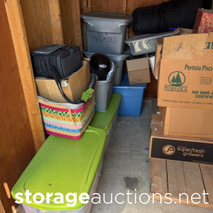 TOTES, HELMET, BOXES, SLEEPING BAG, COOLER, CLOTHES, MISC ITEMS