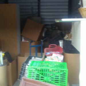 Unit appears to have: Shelving, racks, boxes, rugs, tubs, sinks, dolly