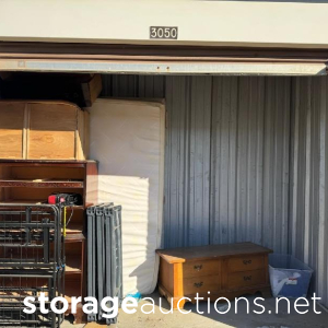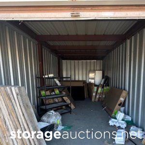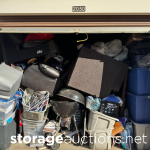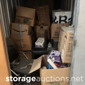 THIS UNIT IS FULL AND WHAT WE CAN SEE IS - LOTS OF BOXES, COMPUTER CHAIR, LOOKS LIKE A CHEST OF SOME KIND, DORM FRIG, END TABLES, AND NEW IN THE BOX WINE CELLAR