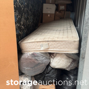 THIS UNIT HAS CLOTHES RACK, CLOTHES, HEADBOARD, FUTON MATTRESS, SCOOTER, FLOOR JACK, DRESSER, NIGHTSTAND, GAMES, TV, TOOLS, IRON, PICTURES AND TOTES AND BOXES