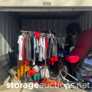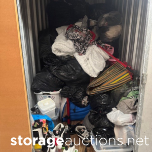 THIS UNIT HAS LOTS OF BAGS, BOXES, MENS SHOES, GIRL TRIKE, RAKE, RUG, BLANKETS AND TIRE PUMP