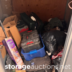 this unit appears to contain bags, clothing, bedding, ladder, 2 totes, tool cart, tool box, RC remote control cars and boats, bag of soil, shoes, scooter, food, food trays, fish tank, dresser, car tire, games, DVDs, tool bag, misc items.