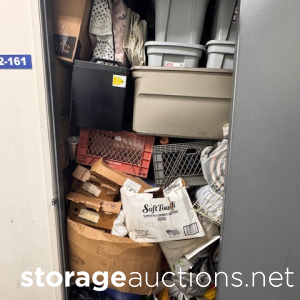 This unit appears to contain, bags, 15 boxes, clothing, bedding, 8 totes, dog food, large duffle bag 2 bar stools, dog gate, futon, wall art, toaster, dog shelter, misc items