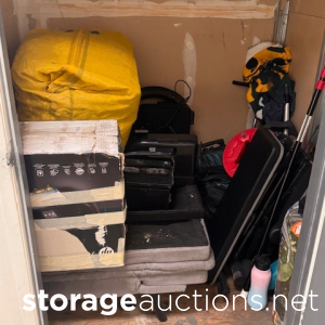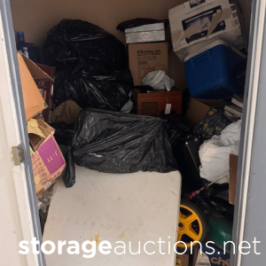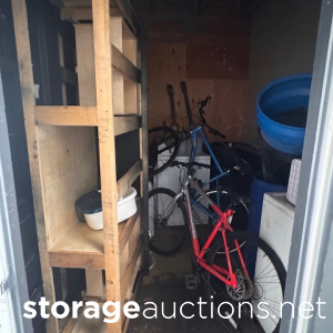This unit appears to contain, bags, clothing, bedding, 4+ boxes, bike, ladder, dollies, hard hat, folding table, golf clubs, tire, sleeping bag, duffel bag, tool bag, misc items.