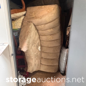 this unit appears to contain, 6 boxes, bedding, ladder, 2 totes, TV, sectional, chairs, milk crates with vinyl records table, dresser, mirror, misc items.