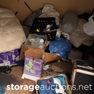 This unit appears to contain, bags, clothing, bedding, lamp, speaker, mini fridge, grill, pot and burner, house hold items, gaming chair, decoration, wall art, scooter, misc items.