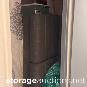 Inside second floor unit lift access, This unit contains stencil, China cabinet, poster, shoe boxes, shoes?, snow board, mattress, futon or section, bag.