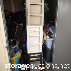 Inside second floor double door unit. This unit appears to contain, clothing, bedding, monitor, 20+ totes, gas griddle, kitchen items, basket, tv, misc items.