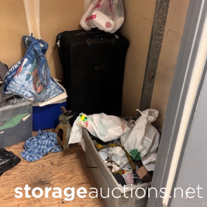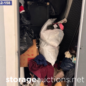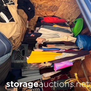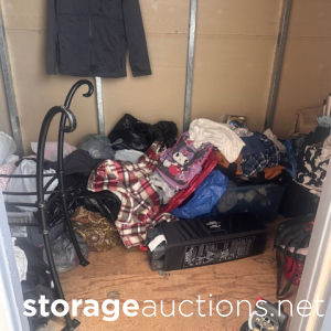 This unit appears to contain, 15+ boxes, clothing, bedding, suitcases, 4+ totes, 2 night stands, bags, decorations, misc items.