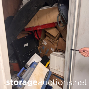 This unit appears to contain 15+ boxes, bedding, TV, printer, sewing machine, red tool box, duffel bag, file box, hand bag, shop vac, misc items.