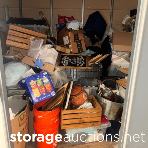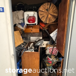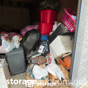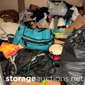 This unit appears to contain clothing, baby play pen, 2 duffel bags, hampers, water hose, skateboard,mini Rams helmet, table top, backpacks, misc items.