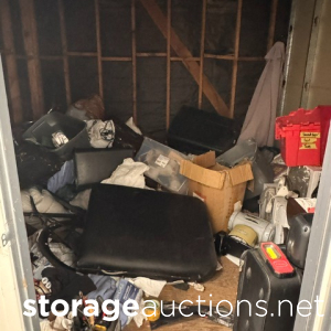 this unit appears to contain air conditioner, 3 suitcases, 5 totes, 1 box, 5 totes, end table, clothing,2 bikes, patio umbrella, bags, tennis racket, massage table, back pack, machine for blood pressure. misc items.
