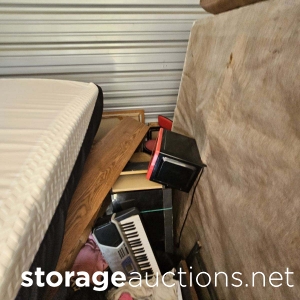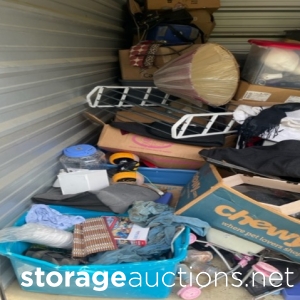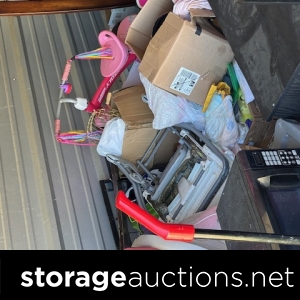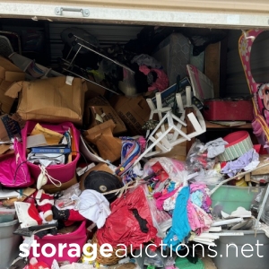 clothes, shoes, cups, skate board, handbags, storage bins, packed boxes, and more.