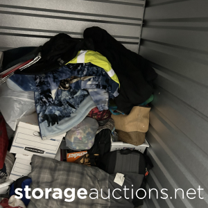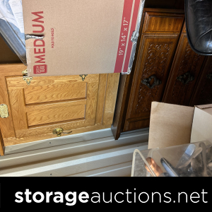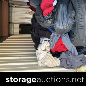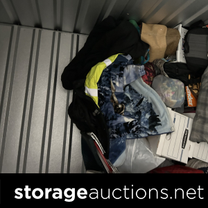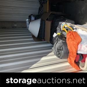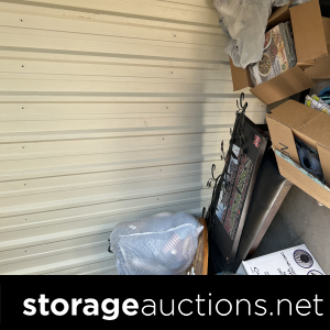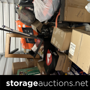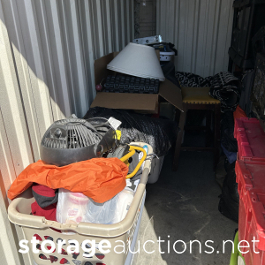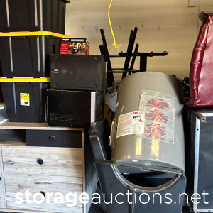 This unit has boxes, totes, sewing machine, skateboard, umbrella