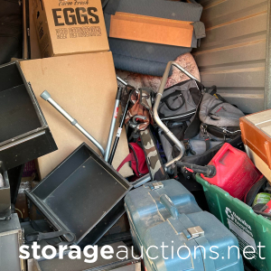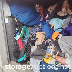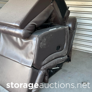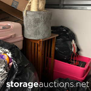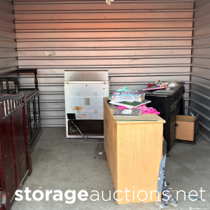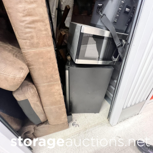 This unit has boxes, tables, couch, fridge, microwave, mattress
