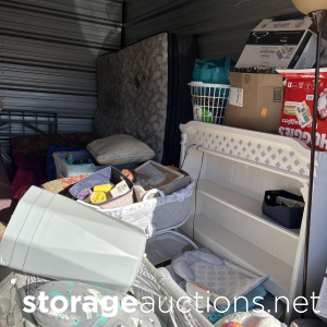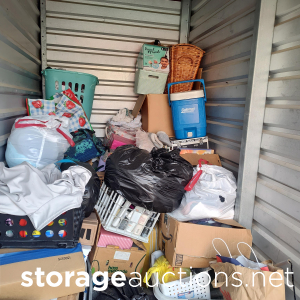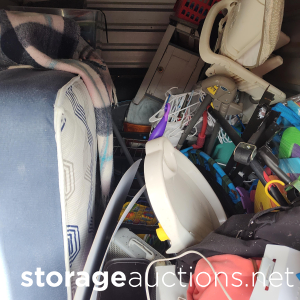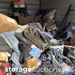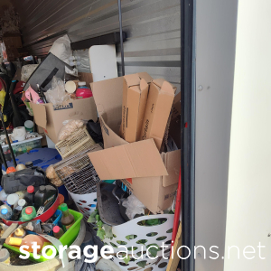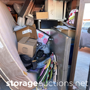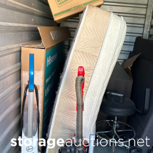 This unit has clothes, suitcase, bed frame, vacuum, boxes, dresser, shop vac