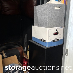 File cabinet, leaf blower, sectional couch, coffee table, garden tools, file boxes, jewelry box,