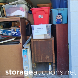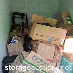 Household items, boxes, trunk, bedroom suite, clothes, table, stool, chair.