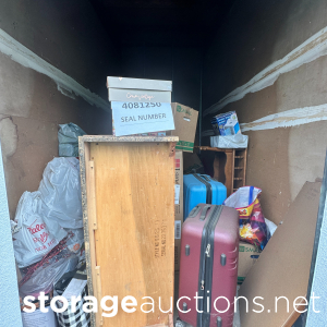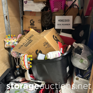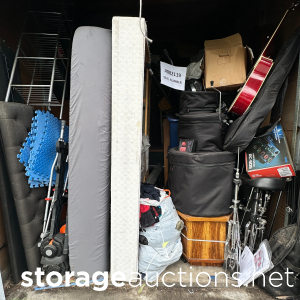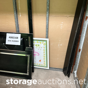 shelving, pvc pipe, totes, boxed, pain cans, oxygen tank, mini fridge, over head lights, luggage, barstools, fish tank, frame plywood, ice chest, book shelf, floor mat, batteries, water jugs, gardening tools, dresser, tire, misc wires, computer desk, milk crates, table top