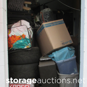 4 plastic totes, 3boxes, 2 tires, 2 stools, small fan, 2 suitcases, 5 Clothing storage bag