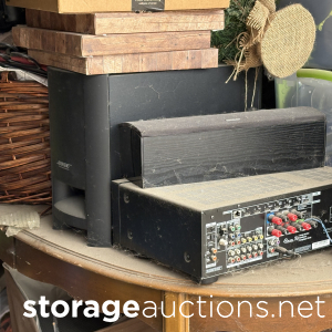 TOTES, AUDIO RECEIVER, BOXES, SPEAKERS, OTTOMAN, KITCHEN TABLE, BASKETS, COMFORTER, MISC ITEMS